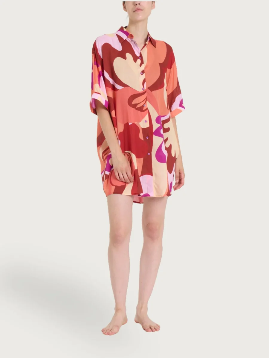 La lunghezza corta (83cm per tg.2) copre delicatamente il costume indossato e la figura offrendo comfort e praticità per affrontare una giornata in riva al mare o per una passeggiata sulla sabbia. Indossabile da solo, ma anche perfettamente abbinabile con i pantaloni della medesima fantasia.