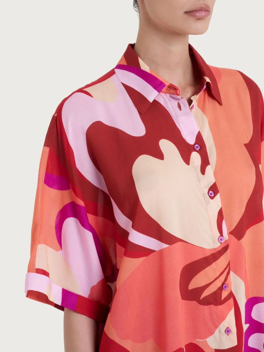 Le maniche kimono aggiungono eleganza e libertà di movimento, grazie al taglio ampio e fluido, mentre il colletto a camicia e l’apertura con bottoni rende facile l’indosso del capo anche nelle giornate più calde.