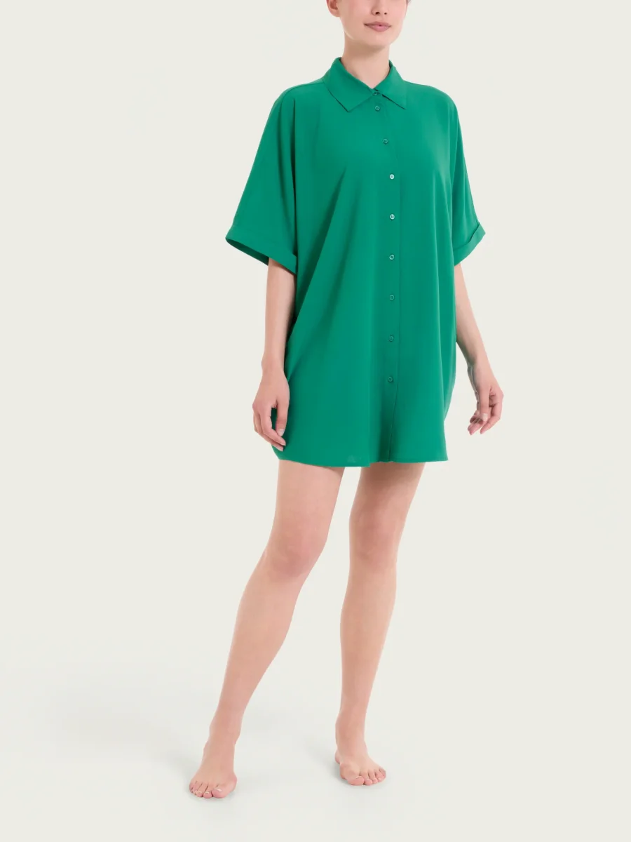 Questo capo tinta unita ha le maniche kimono che rimanendo ampie e leggere donano libertà di movimento, grazie al taglio fluido, mentre il colletto a camicia e l’apertura con bottoni rende facile l’indosso del capo anche nelle giornate più calde.