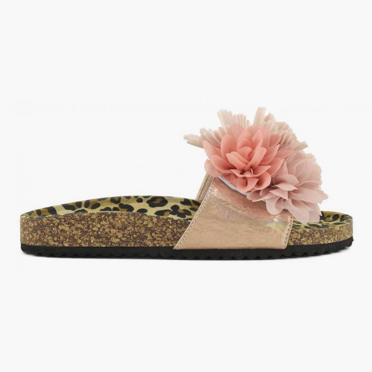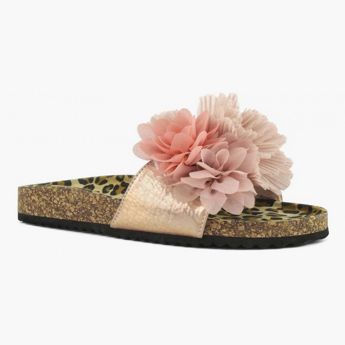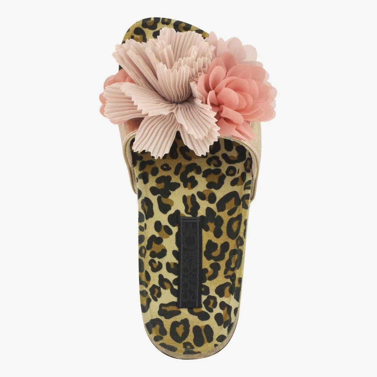Sandalo con suola ampia e ornamento di fiori in tessuto multicolore.