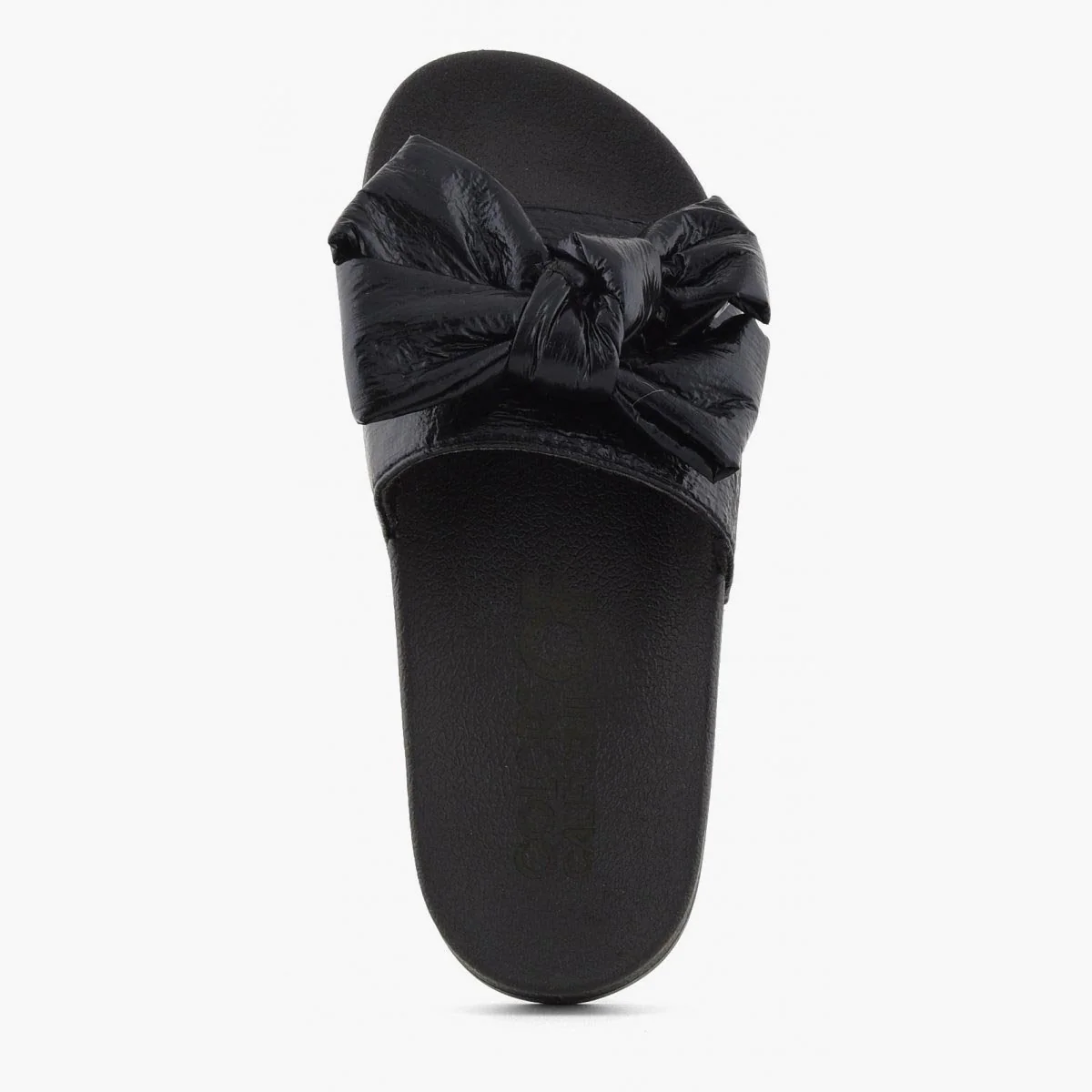 Slippers flat che presentano un fiocco laminato sulla fascia.
