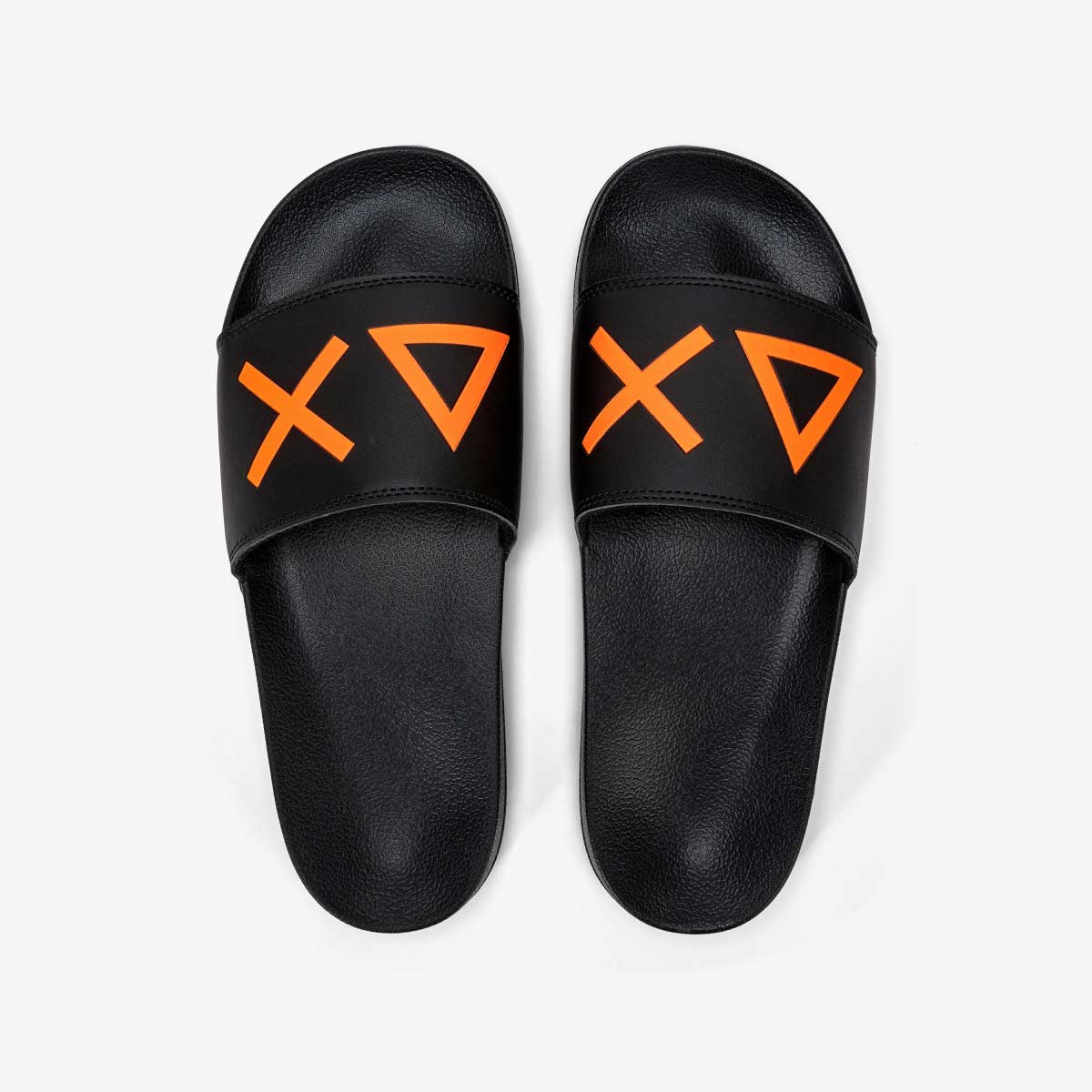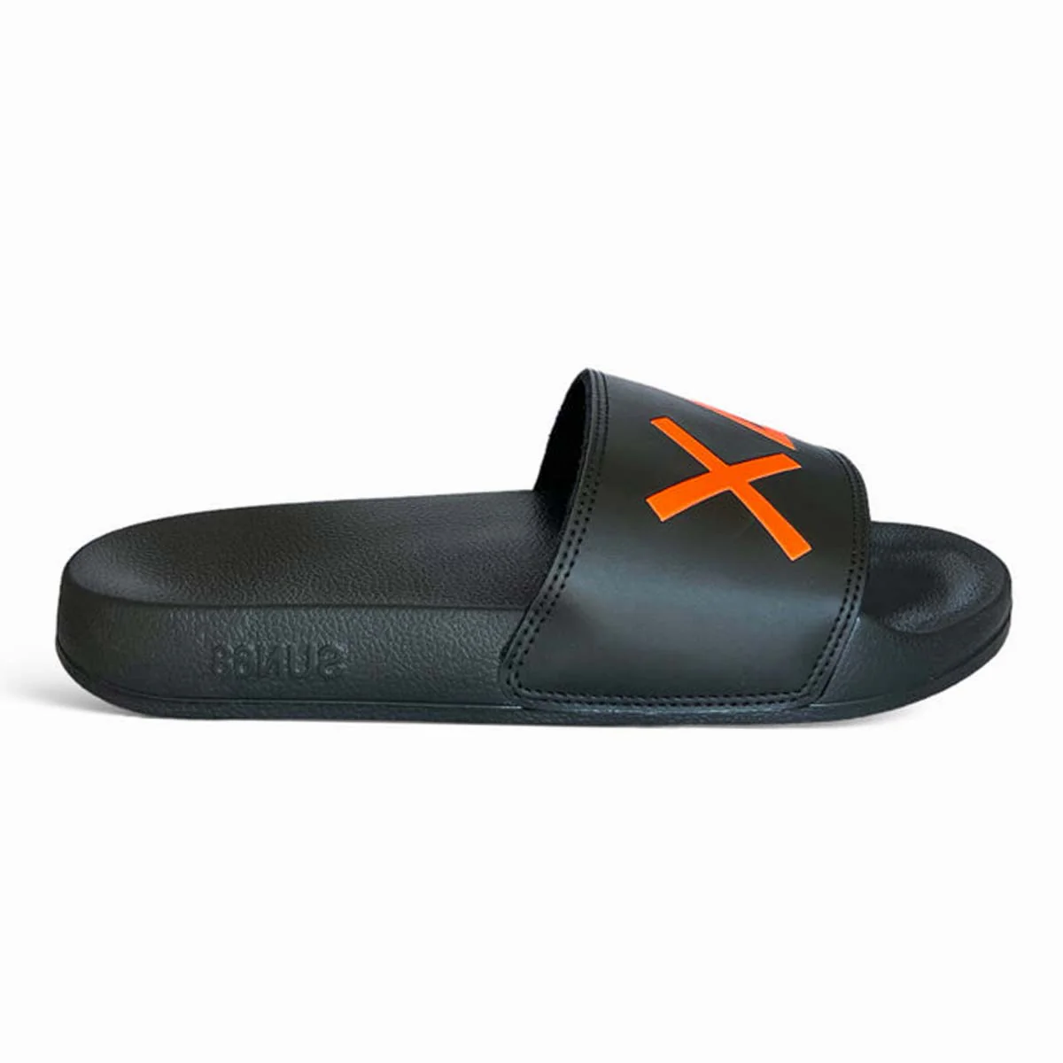 Ciabatte in gomma, punta rotonda, fascia nera con logo in contrasto arancio . Plantare anatomico, suola in gomma. Interno fascia in spugna antiscivolo.