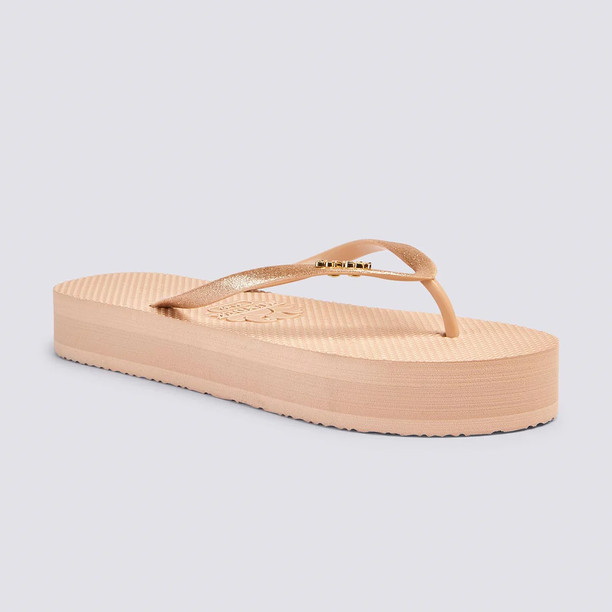 Infradito di gomma a suola lata e glitter applicati sulla parte gommata superiore.