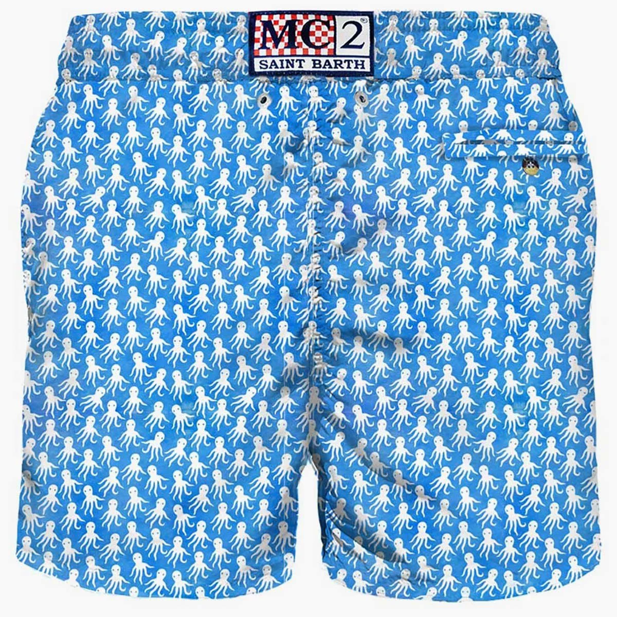 Boxer da mare uomo, micro fantasia polipi su sfondo azzurro, tessuto leggero ad asciugatura ultra rapida, media lunghezza, slip interno ergonomico, chiusura a cordoncino, tasca anteriore e posteriore con bottone.
