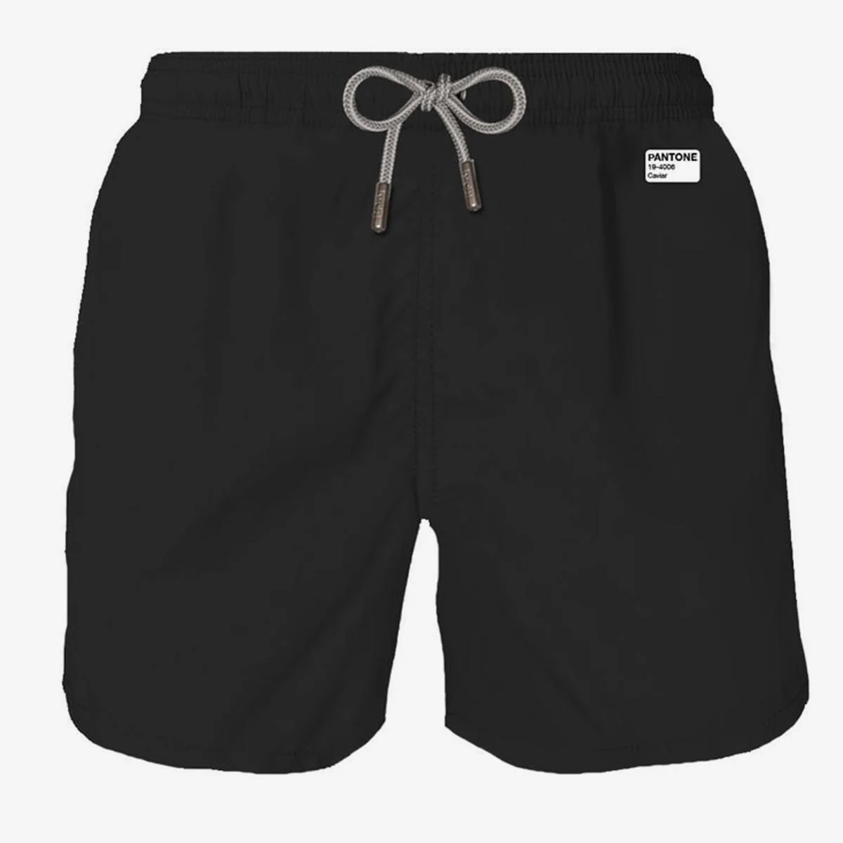 Boxer da mare uomo, in tessuto leggero ad asciugatura rapida, microfibra colore pantone nero, media lunghezza, tasche laterali, slip interno ergonomico, chiusura a cordoncino. etichetta logo pantone frontale e posteriore.