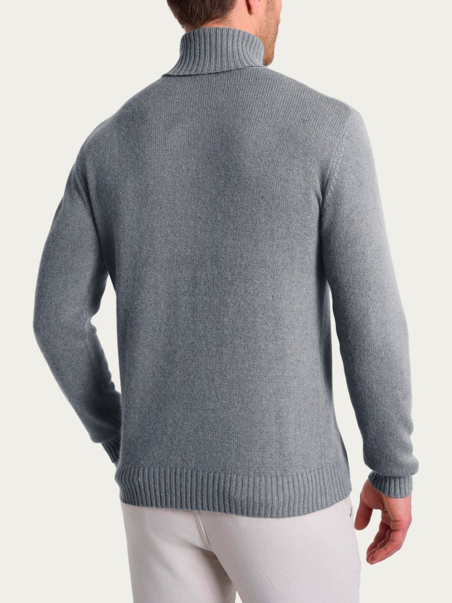 Il collo roulè alto, morbido e avvolgente, dona al capo un’eleganza sobria e protezione dal fresco.