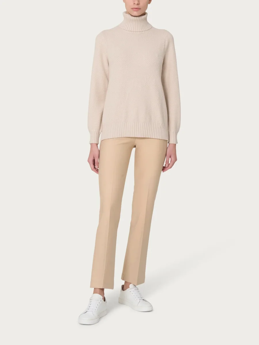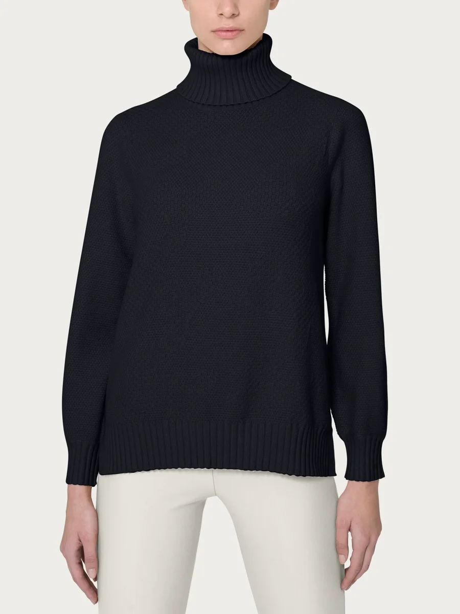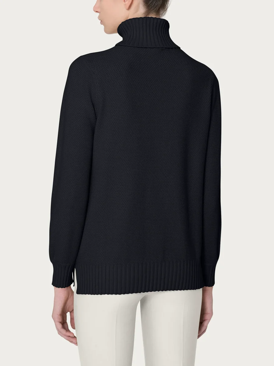 Maglia con collo a roulè da donna in misto viscosa, tessuto in finezza 7, caldo morbido e pratico.