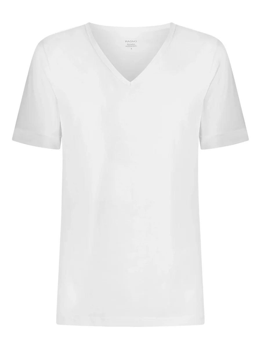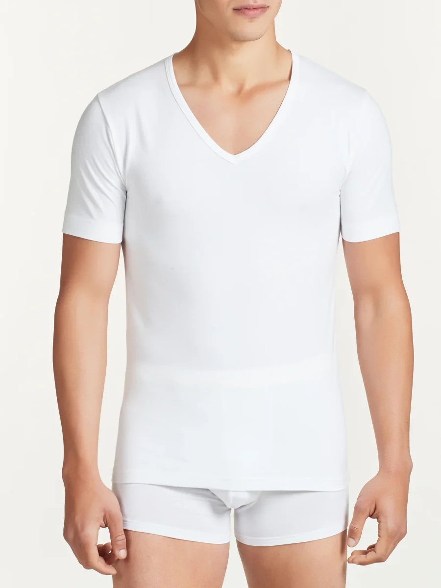 Maglietta scollo a V a manica corta in jersey di cotone elasticizzato.