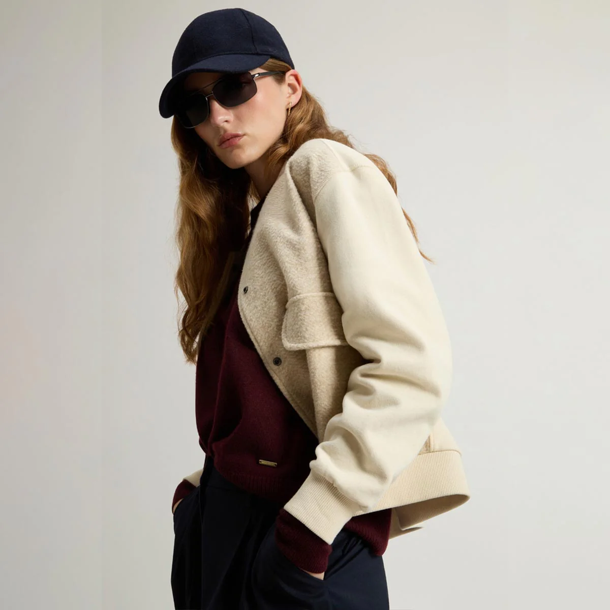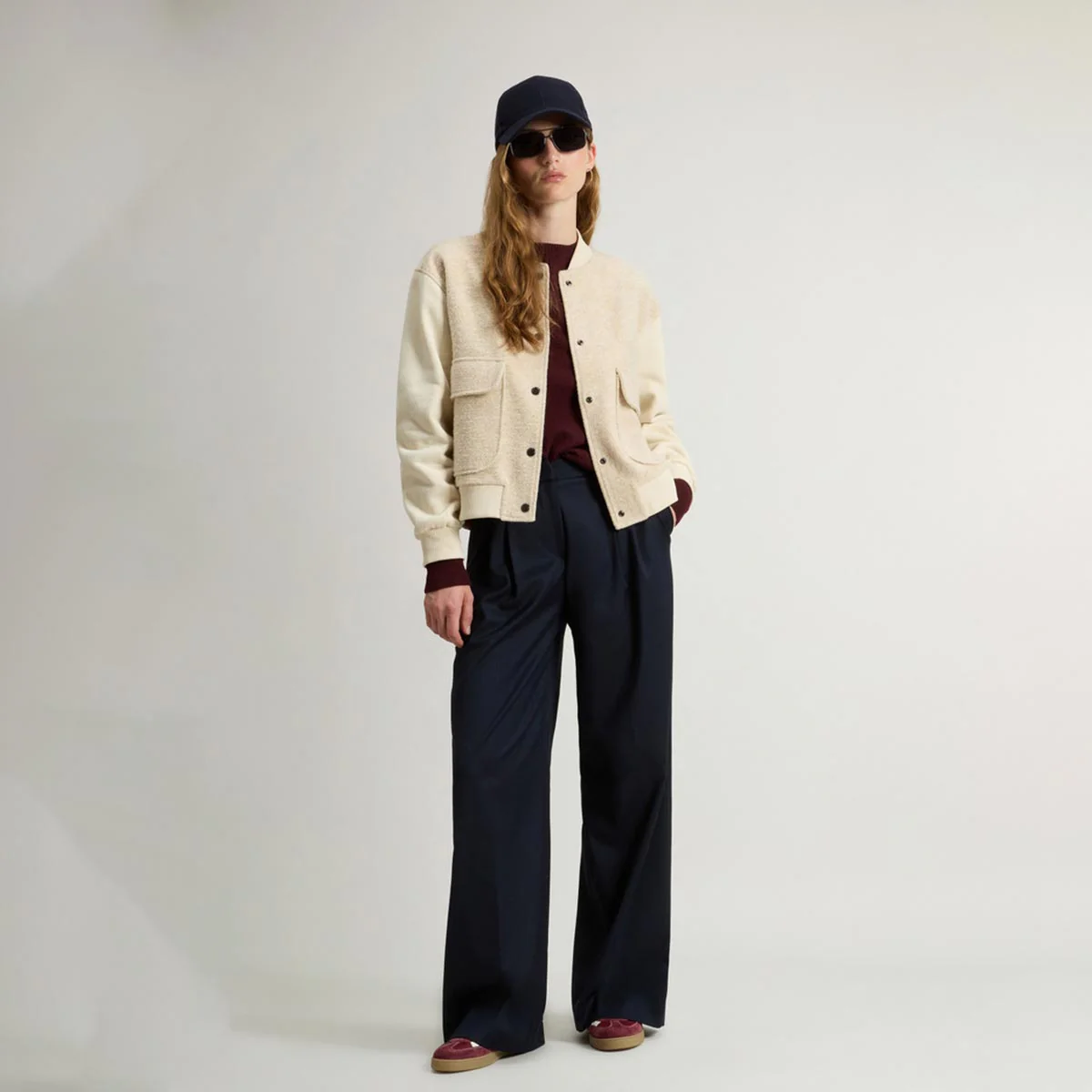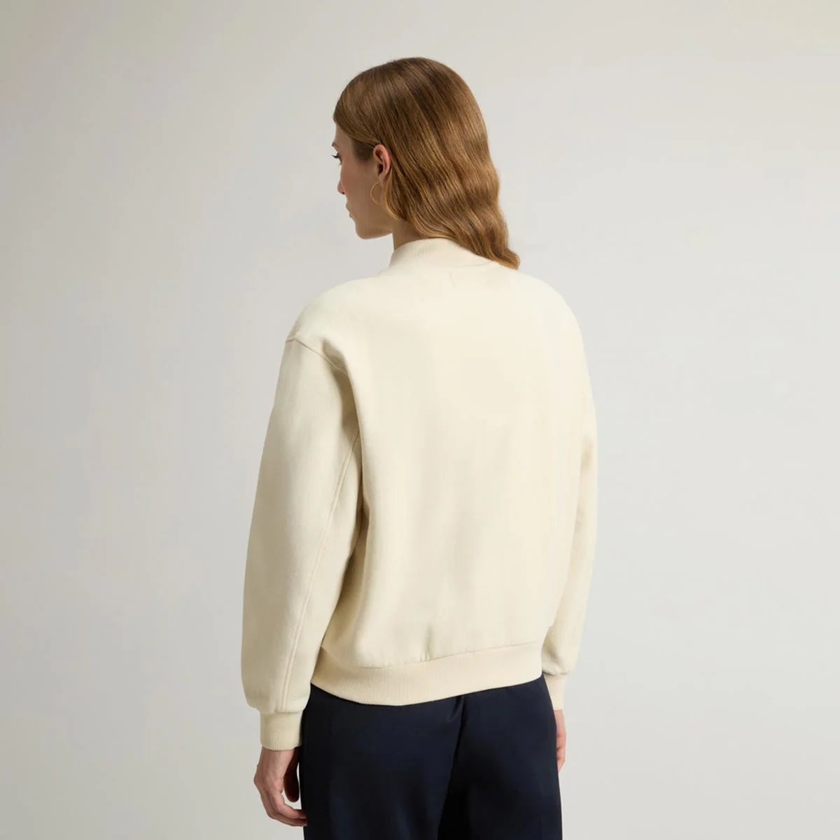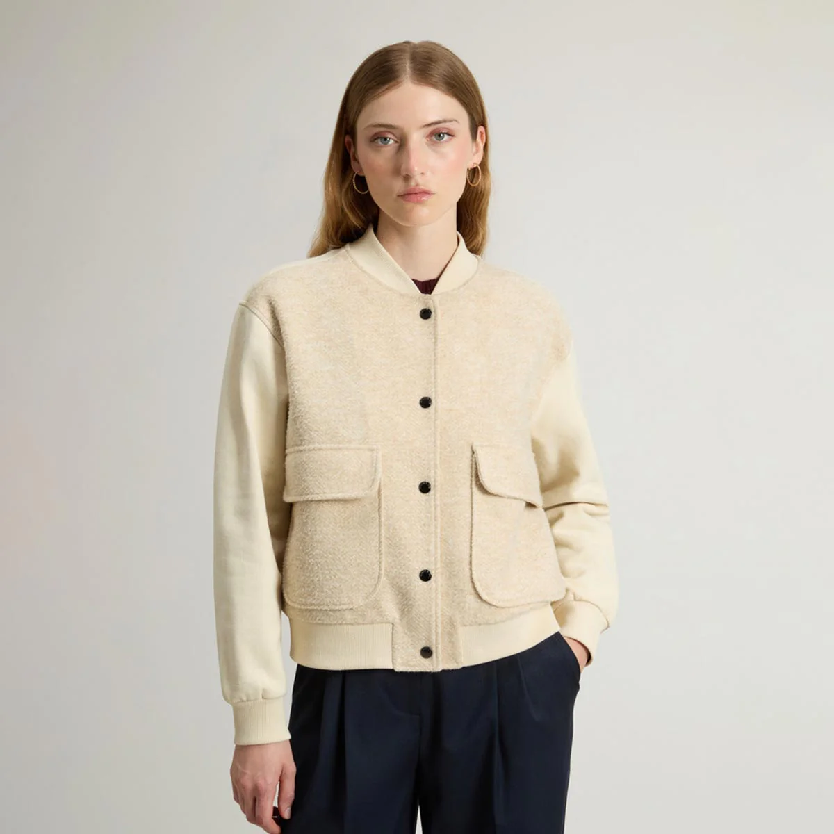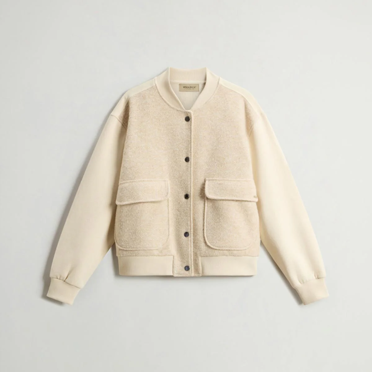 Felpa in puro cotone spazzolato. Ispirata al classico bomber da baseball, si distingue per la parte anteriore in misto lana vergine, impreziosita da un motivo spigato che dona profondità alla texture del tessuto. Chiusura con bottoni a pressione e tasche applicate con patta, collo, polsini e fondo a costine. Tasca sinistra è rifinita con una targhetta logata Woolrich.