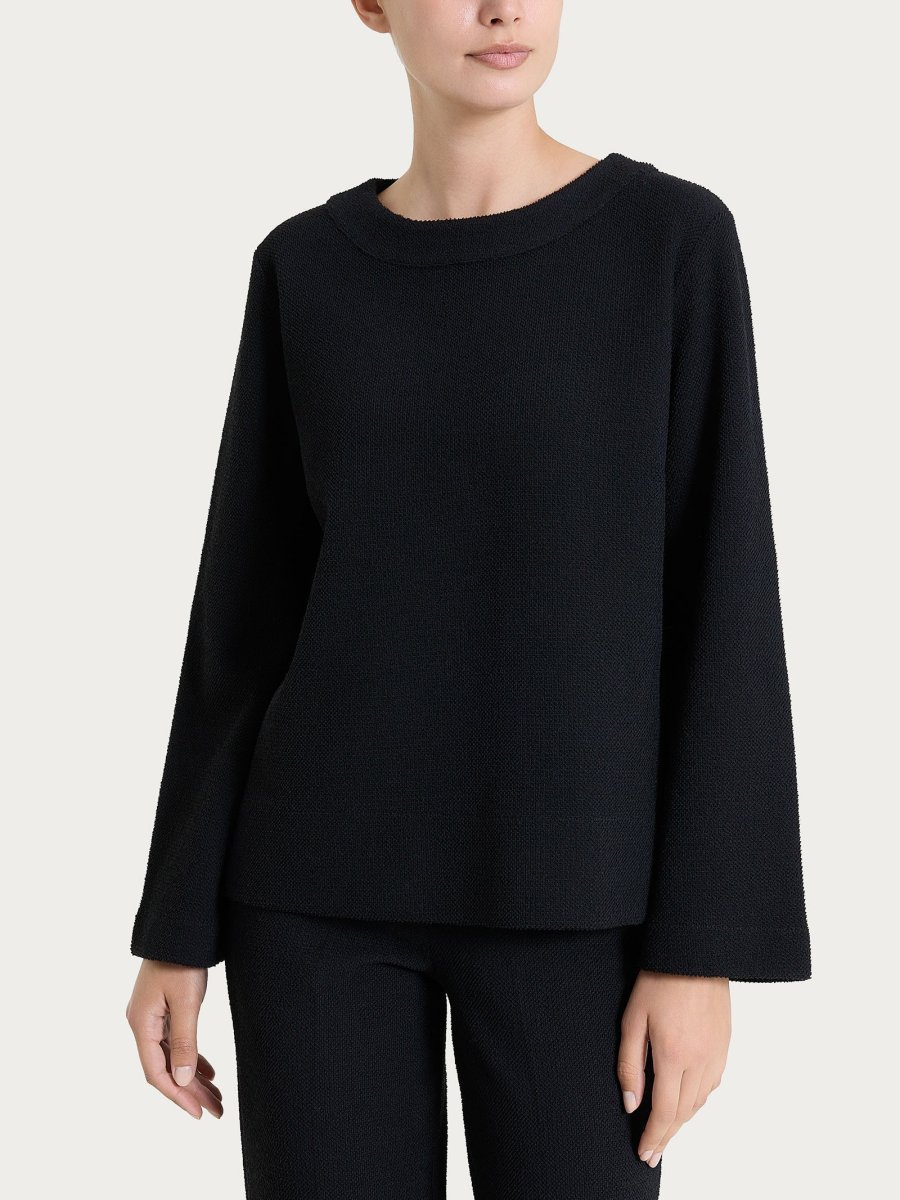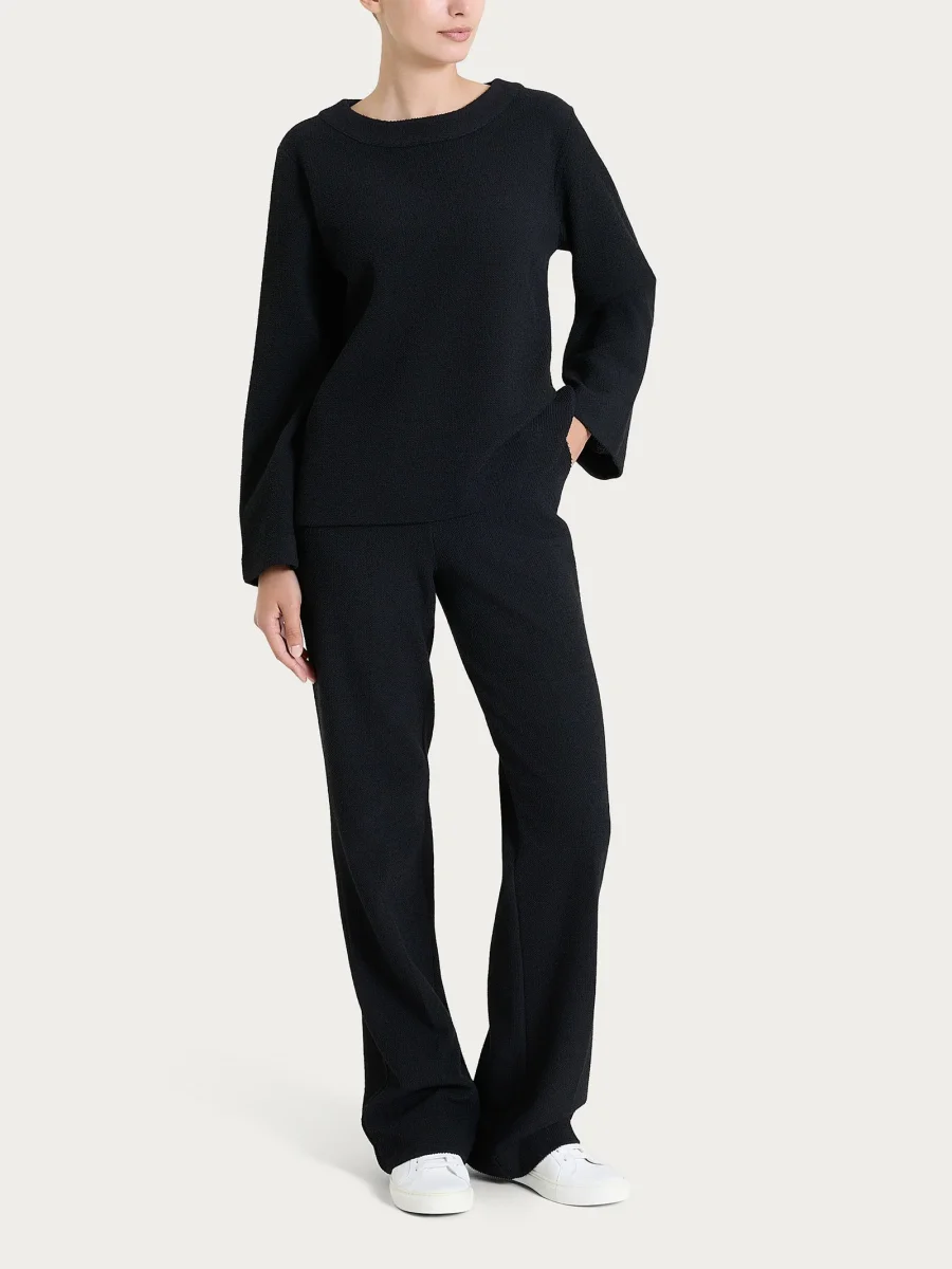 Questo capo avvolge delicatamente la base del collo, conferendo un aspetto elegante, mentre assicura una sensazione di morbidezza e comfort sulla pelle. Le maniche ampie si appoggiano al corpo con leggerezza, senza costrizioni, e sono rifinite da un bordo che si ripete anche sull’orlo inferiore del capo.