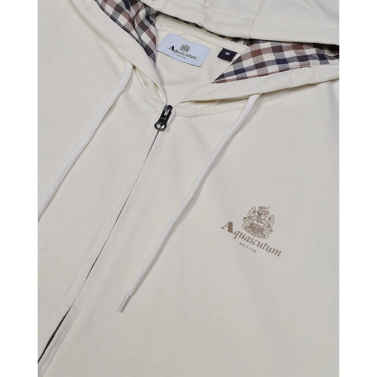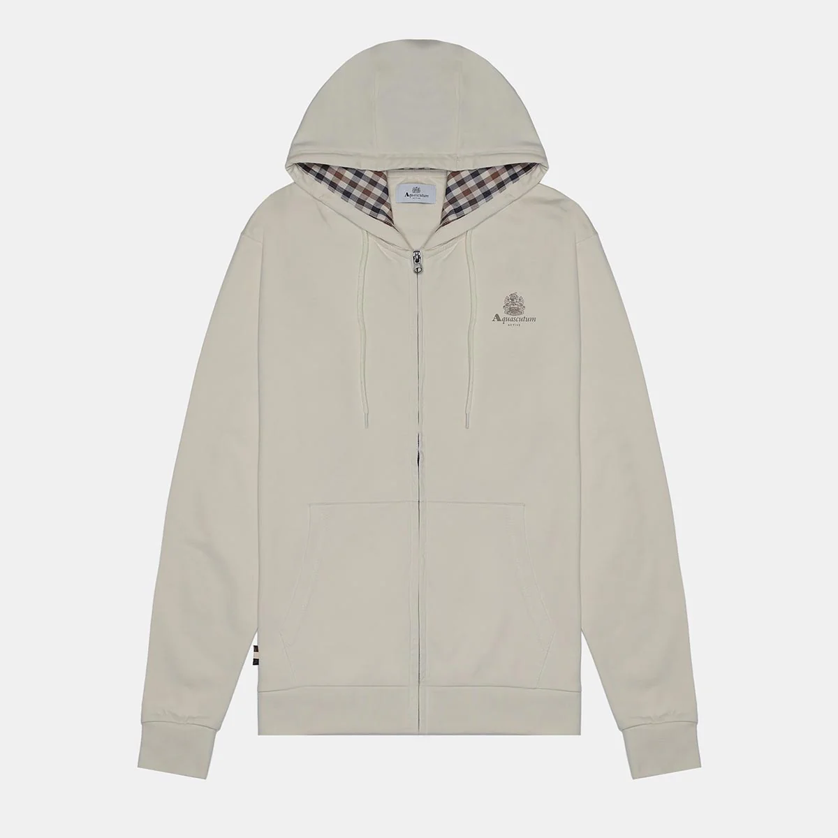 Aquascutum marchio storico britannico. Felpa realizzata in 100% cotone , regular fit con cappuccio foderato Club Check regolabile con coulisse abbinati, in tinta unita con logo stampato sul petto e chiusura a zip avanti.