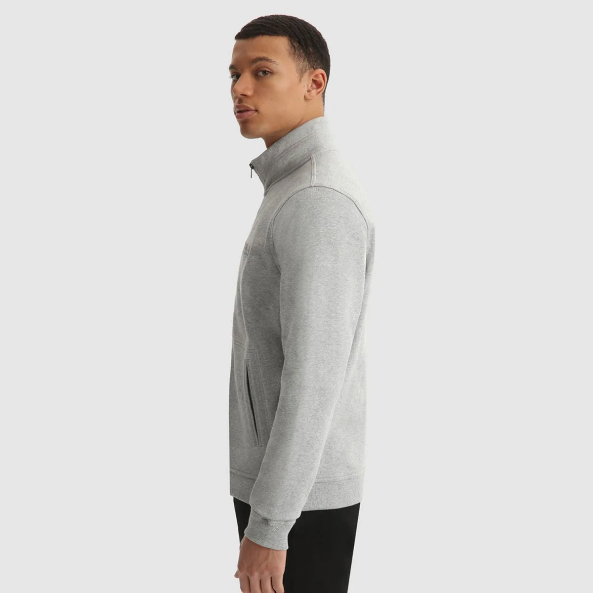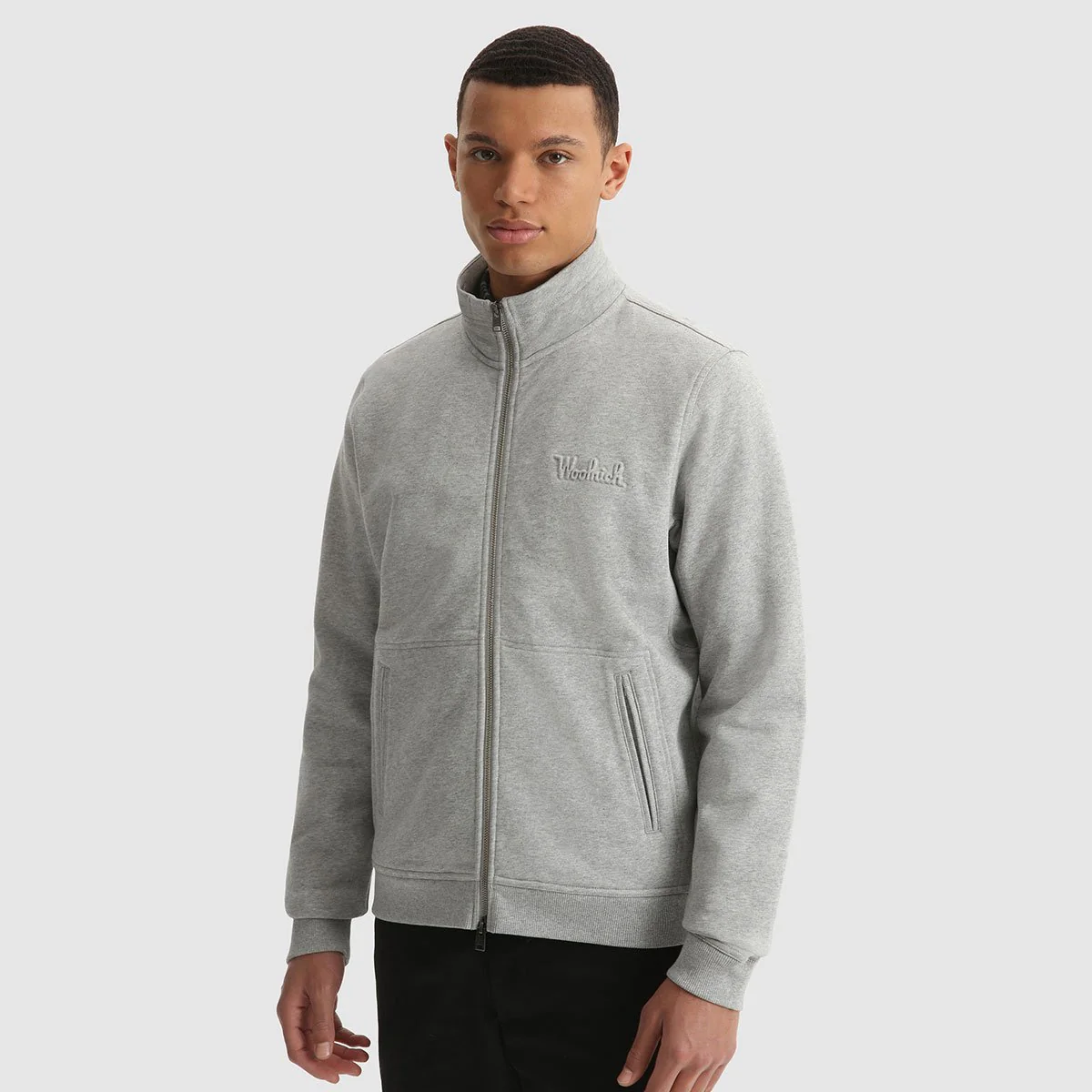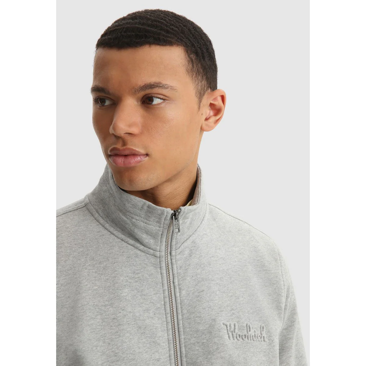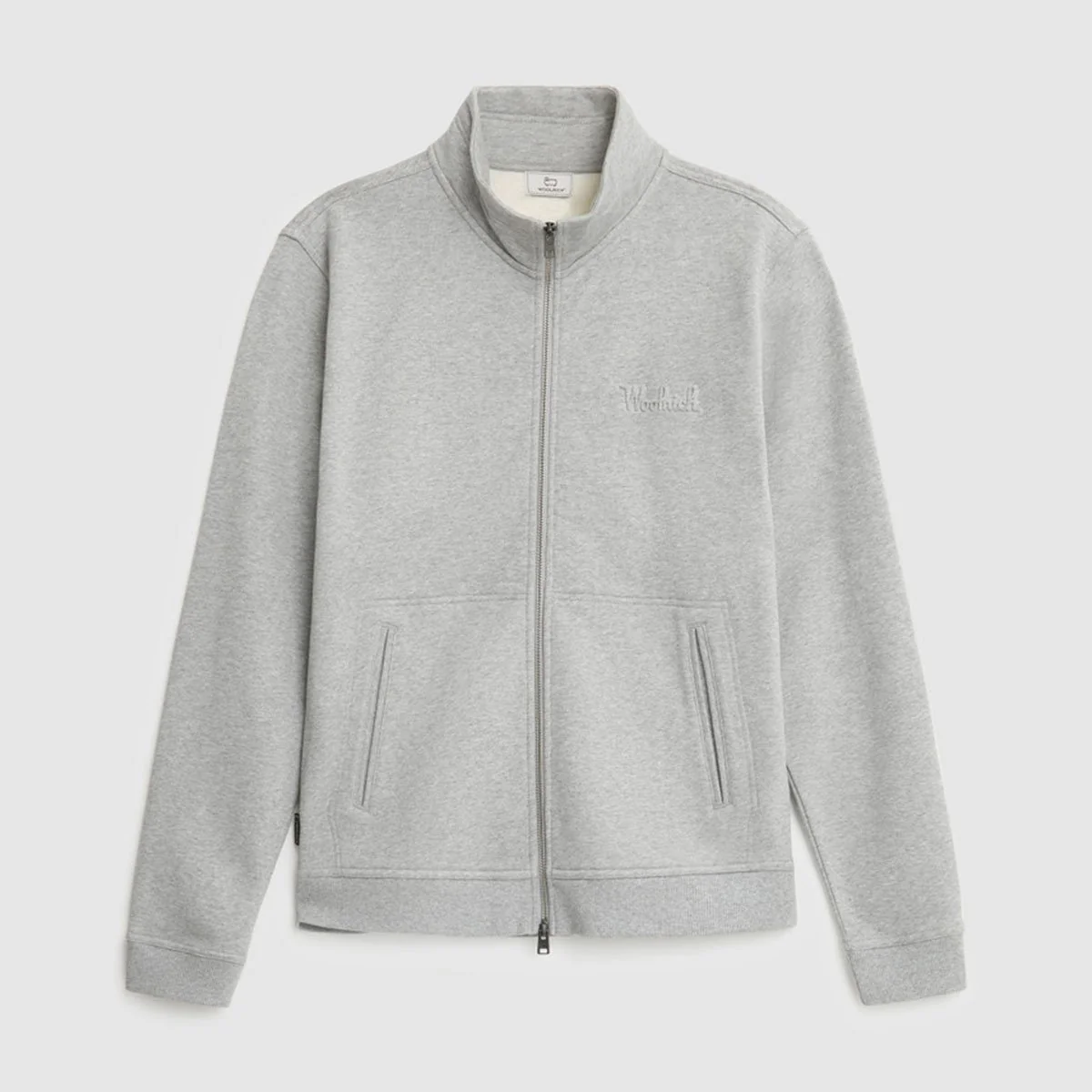 Felpa grigia con collo alto in un lussuoso pile invernale in cotone spazzolato. Chiusura a zip con tiretto con logo. Polsini e orlo elasticizzati. Tasche a marsupio. Scritta tonale Woolrich in rilievo sul petto. Tag con logo sul lato destro.