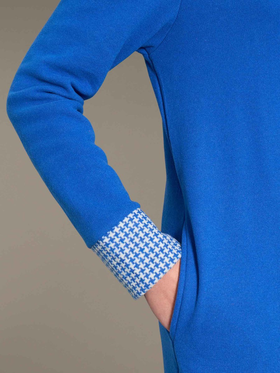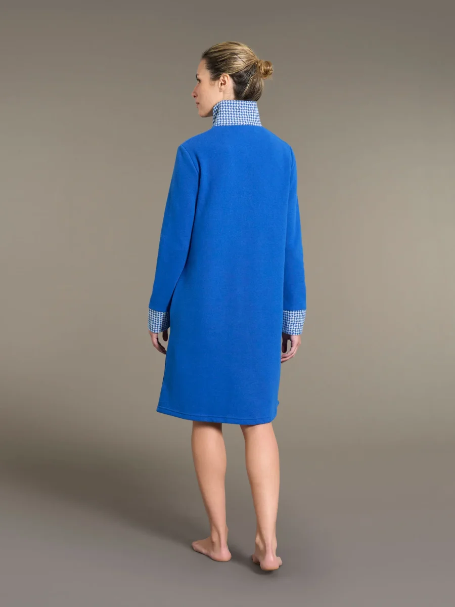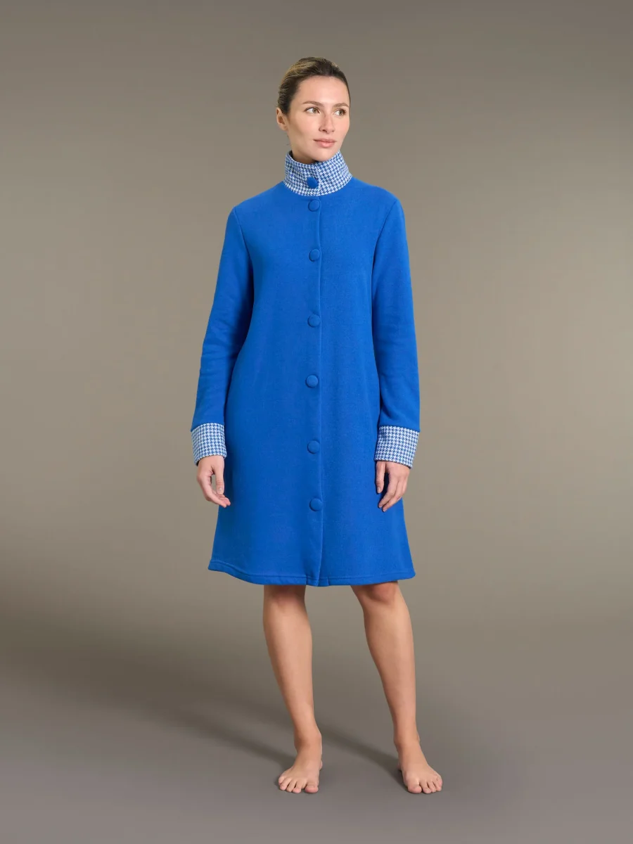 Realizzata in Cotton Eco Pile, un tessuto morbido e avvolgente, questa giacca da camera presenta un design elegante a tinta unita con collo e polsini in fantasia pied de poule. I bottoni rivestiti completano il look elegante e pratico.