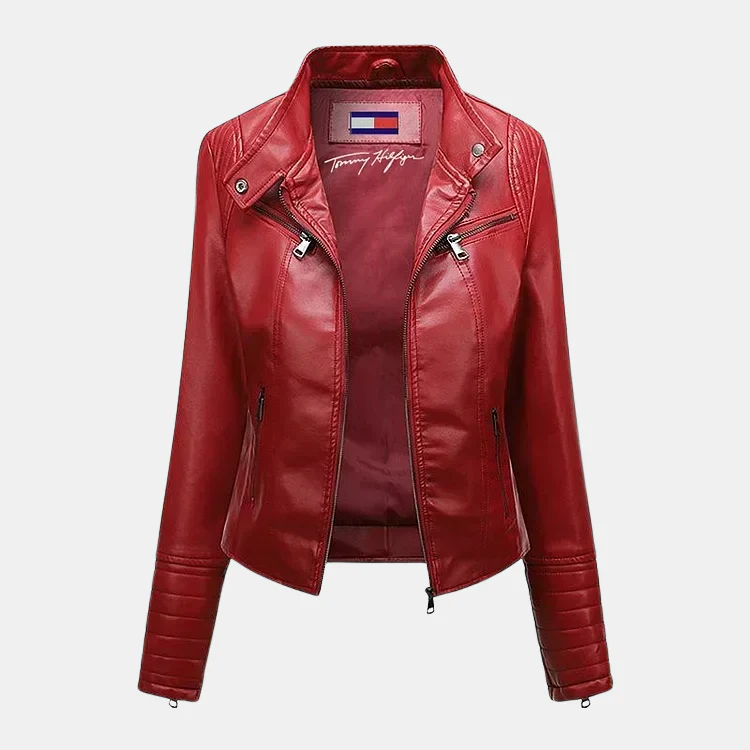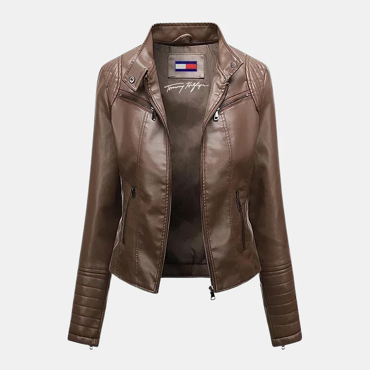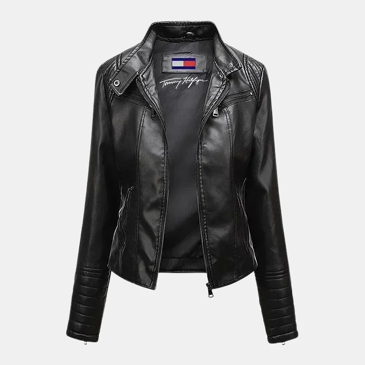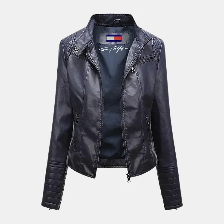 Questa giacca da donna, ispirata all’abbigliamento da motociclista, aggiunge carattere a qualsiasi outfit. Il taglio corto e sagomato valorizza la silhouette per un tocco moderno.