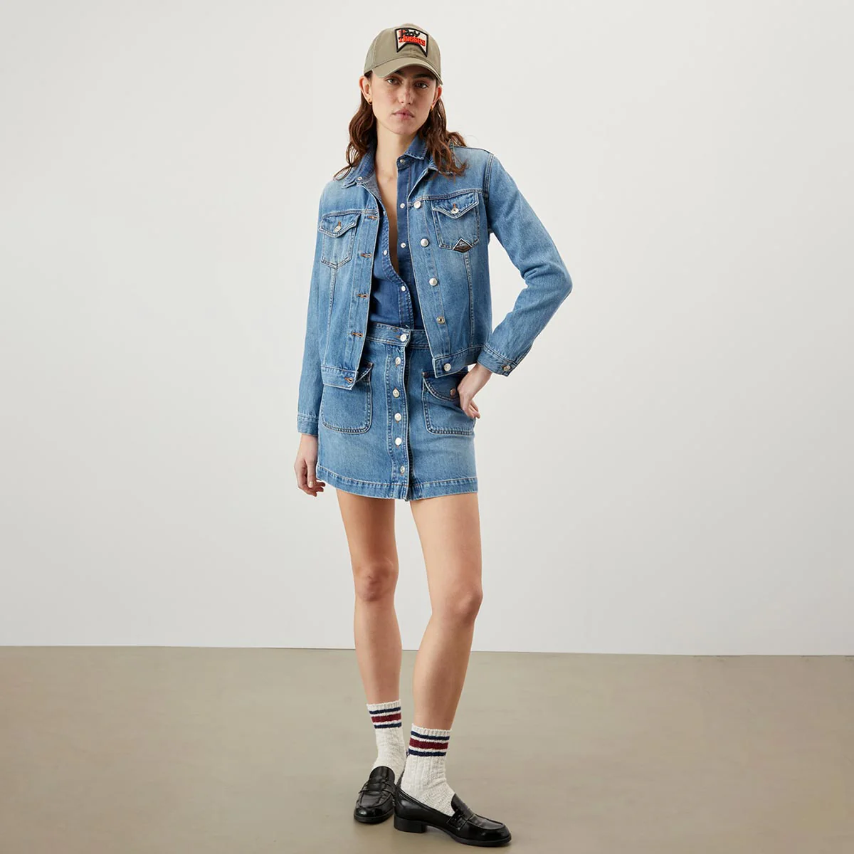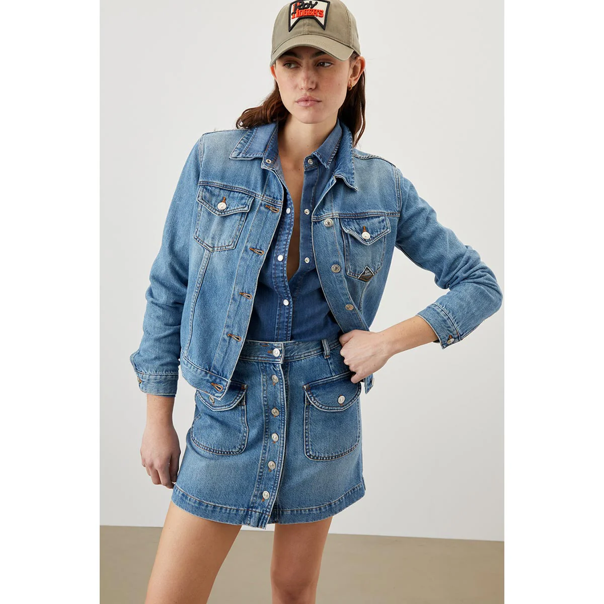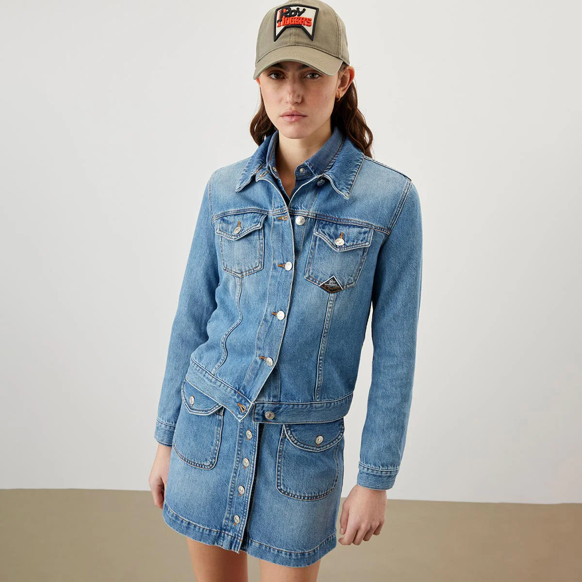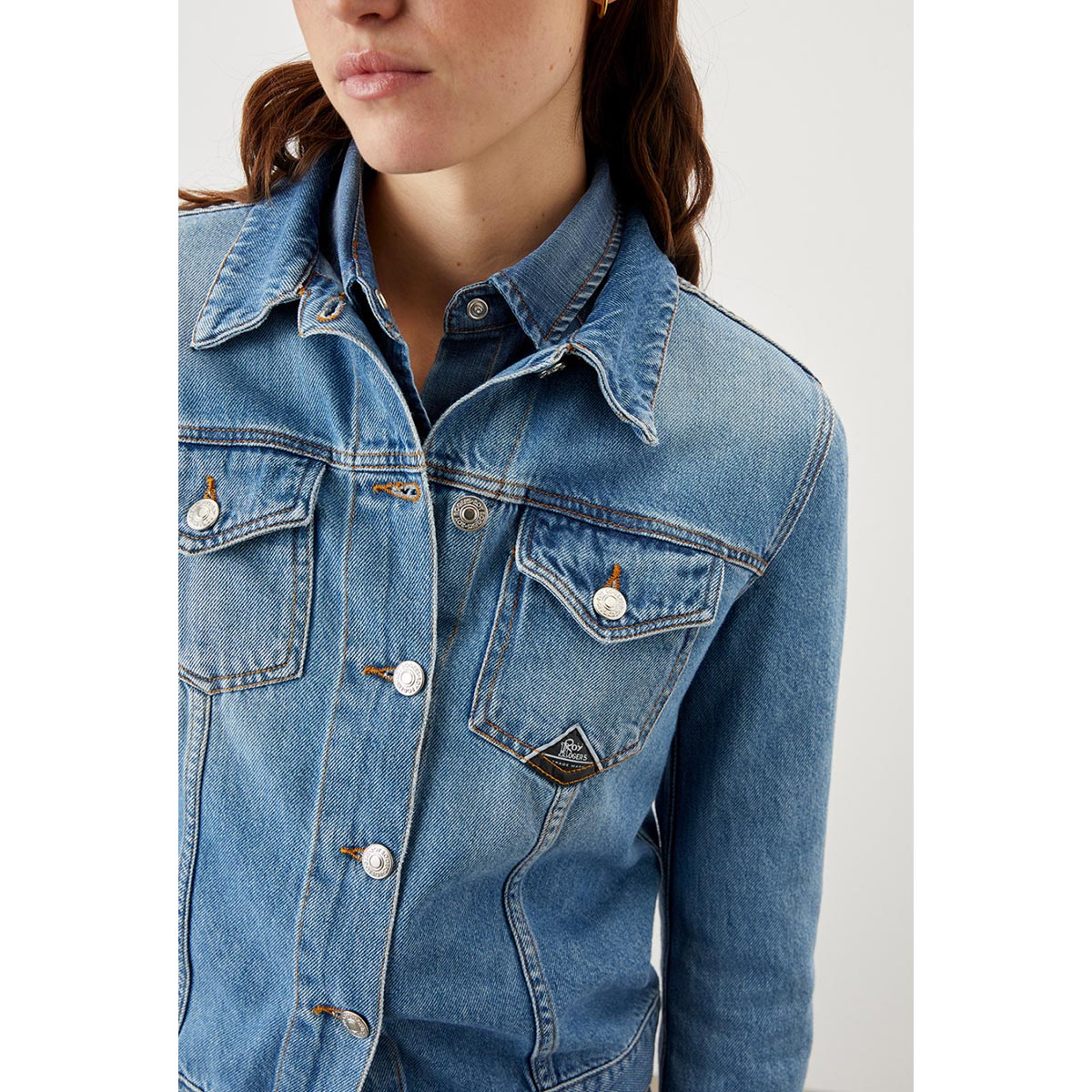 Giacca classica in denim new standard con lavaggio chiaro. Chiusura sul fronte con bottoni logati. Maniche lunghe e polsini con bottoni. Due tasche piatte sul petto con patta e bottone, e due tasche a filetto sul fronte. Label Roy Roger’s applicato su una tasca. Regular fit.
