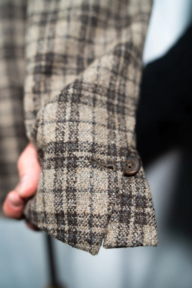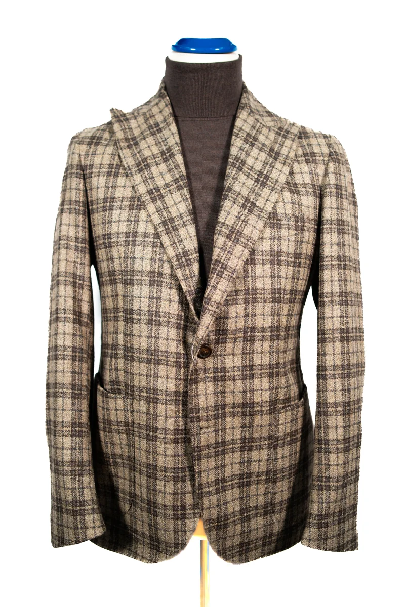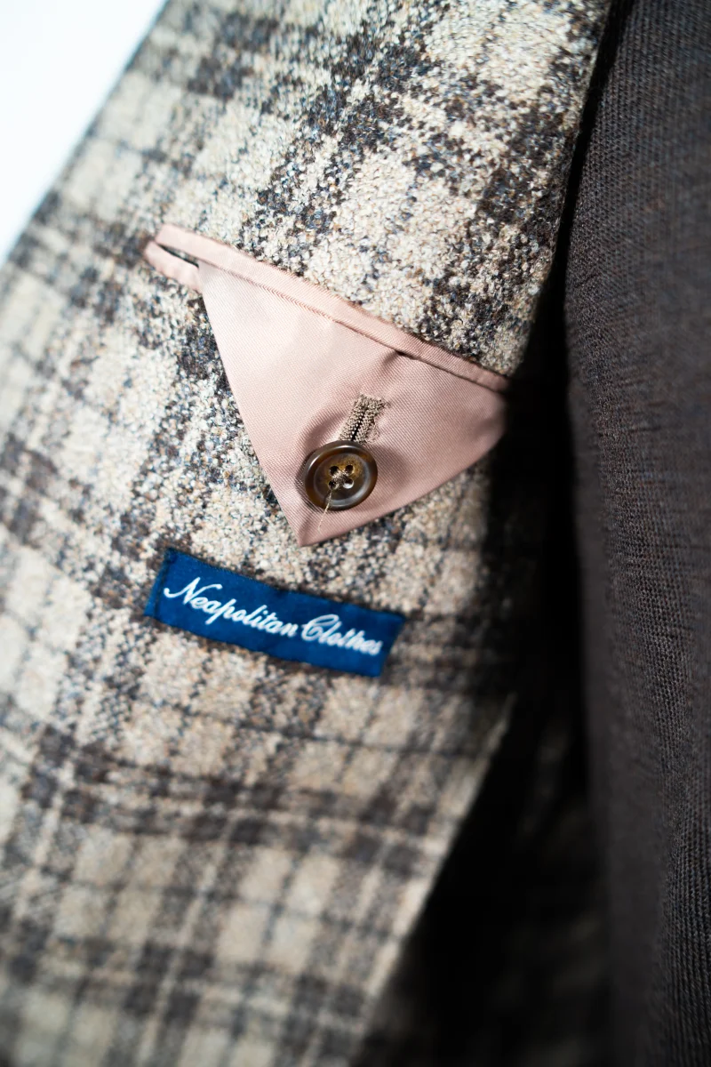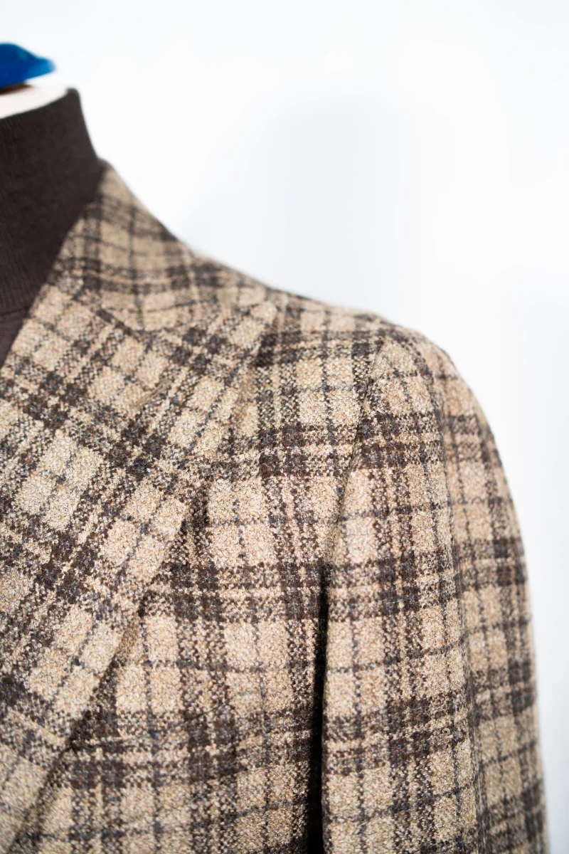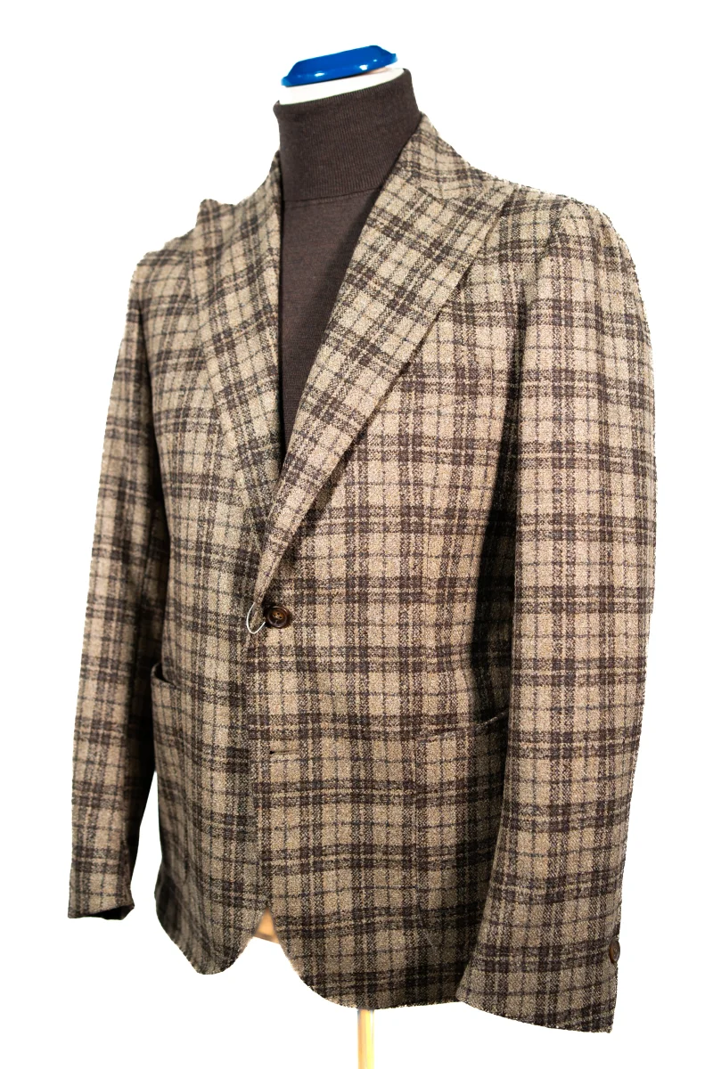 Un’asola alle maniche, due tasche a toppa, completamente sfoderato, spalla napoletana destrutturata arricciata.