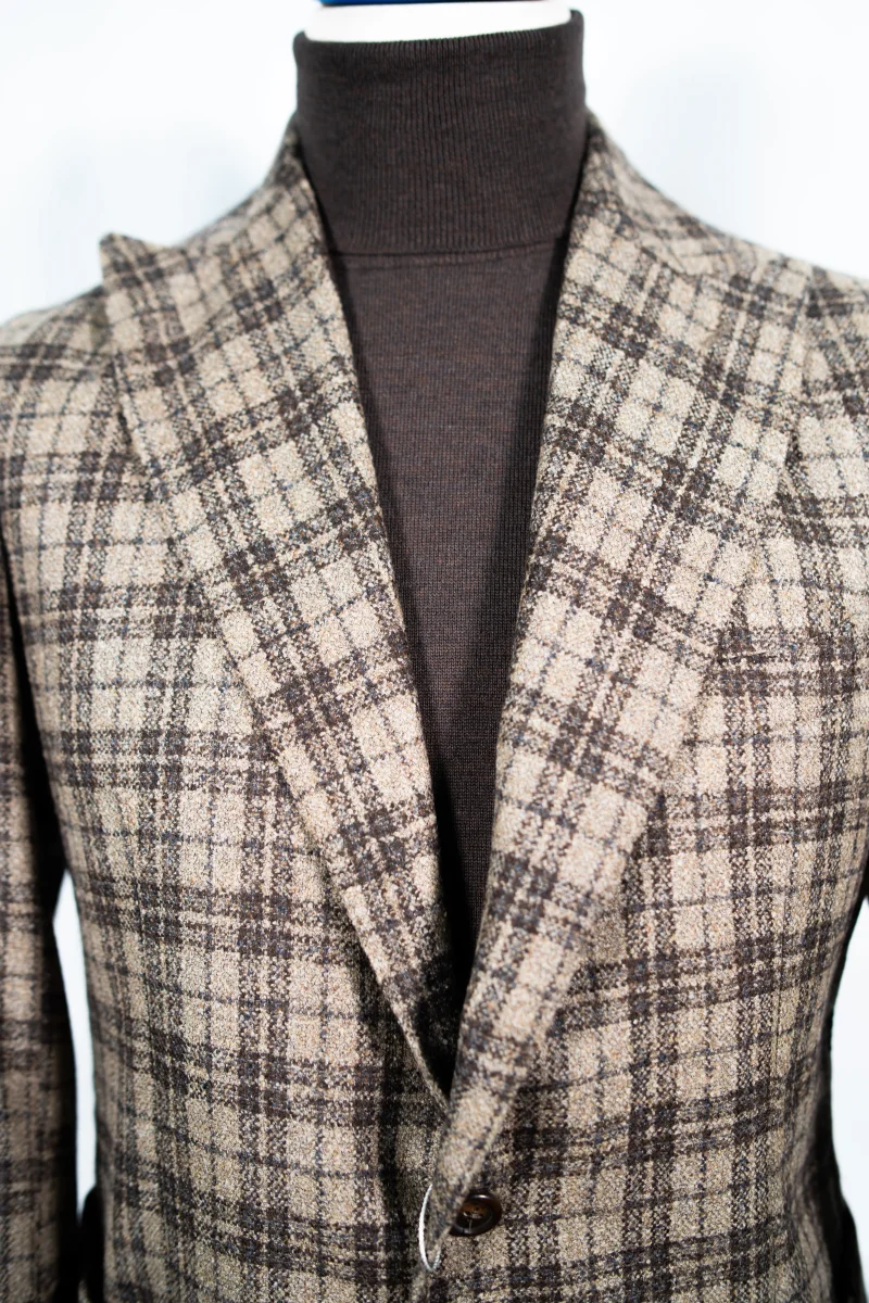Giacca color corda in fantastia galles testa di moro, rever a lancia 11 cm monopetto due bottoni.