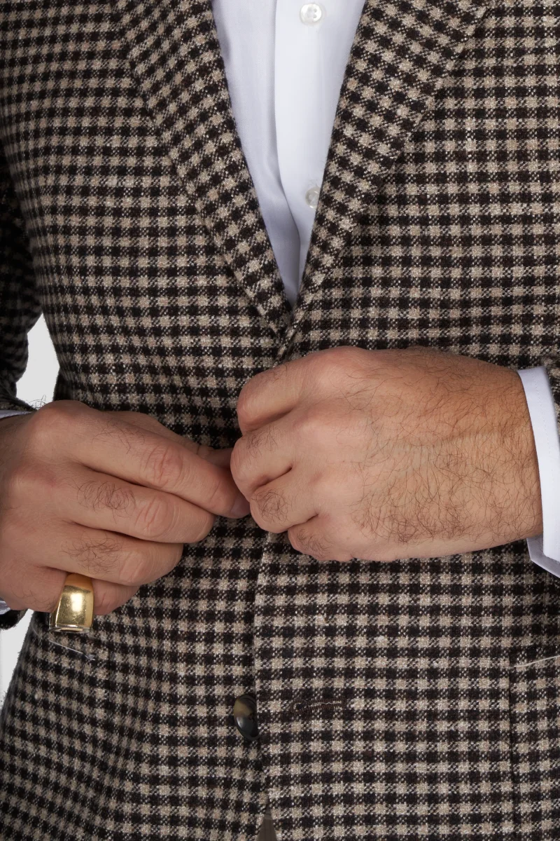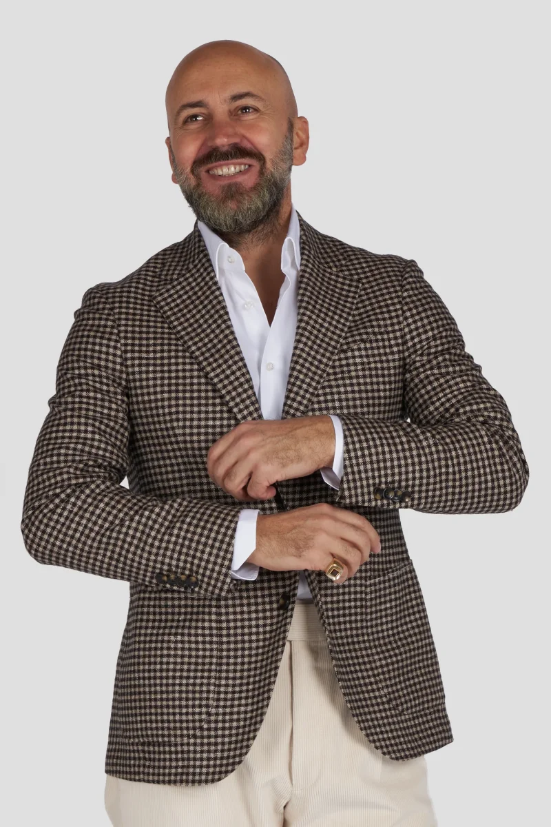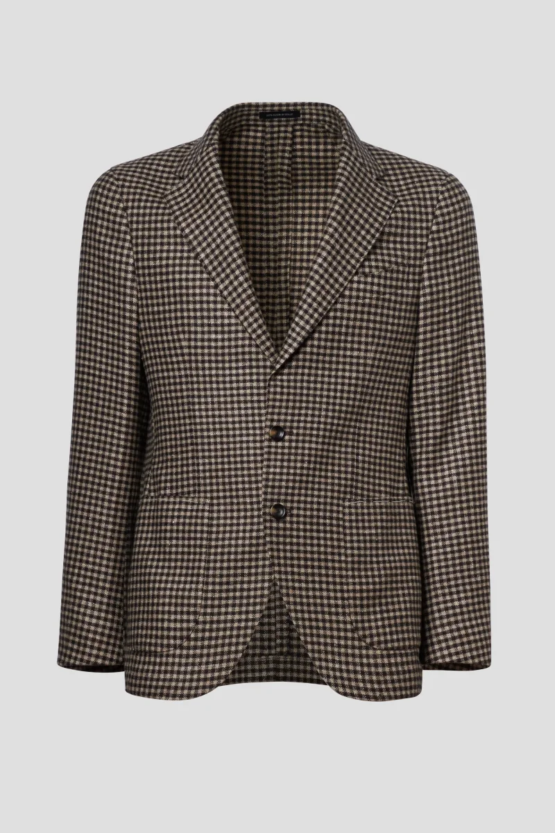 Descrizione: Giacca realizzata in lana seta e cashmere con fantasia quadretto testa di moro su fondo sabbia, sfoderata. Tasca a toppa e doppio spacco laterale sul retro. Chiusura due bottoni. Made in italy.
