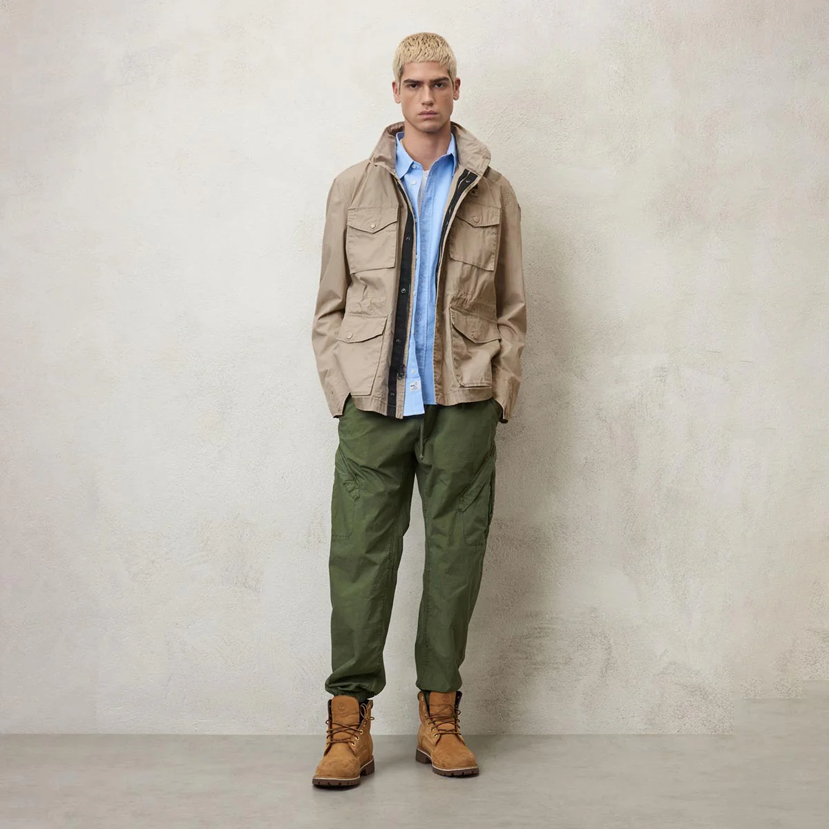 Quattro tasche a soffietto, due applicate sul petto con pattina e automatico centrale di chiusura e due più in basso con doppia apertura: una orizzontale, con pattina e automatico nascosto, e una verticale sul fianco.