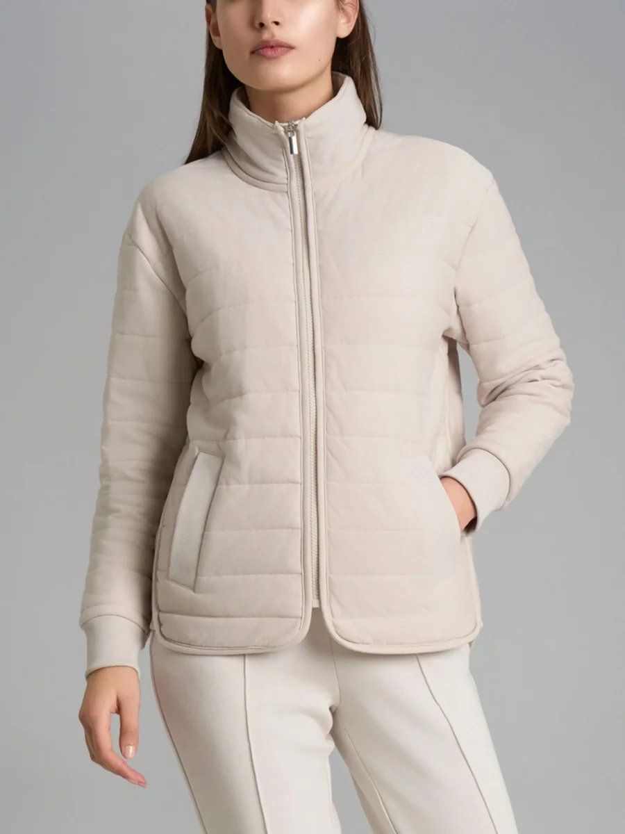 La trapuntatura leggera garantisce comfort e protezione senza appesantire la silhouette, mentre la chiusura frontale con zip dona un tocco moderno e funzionale.