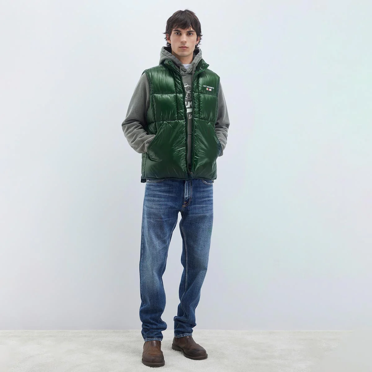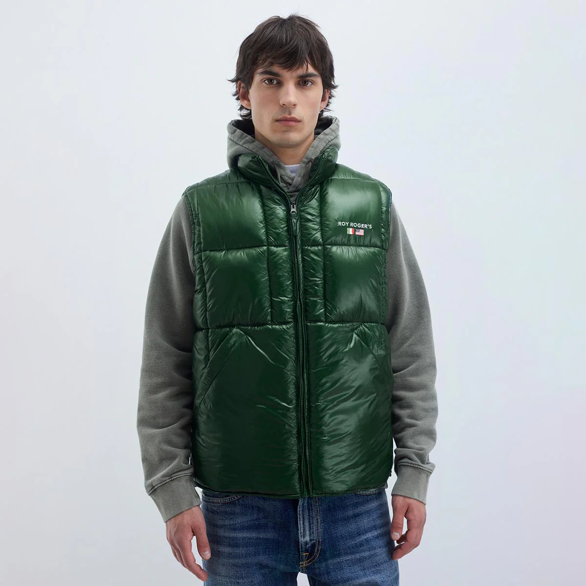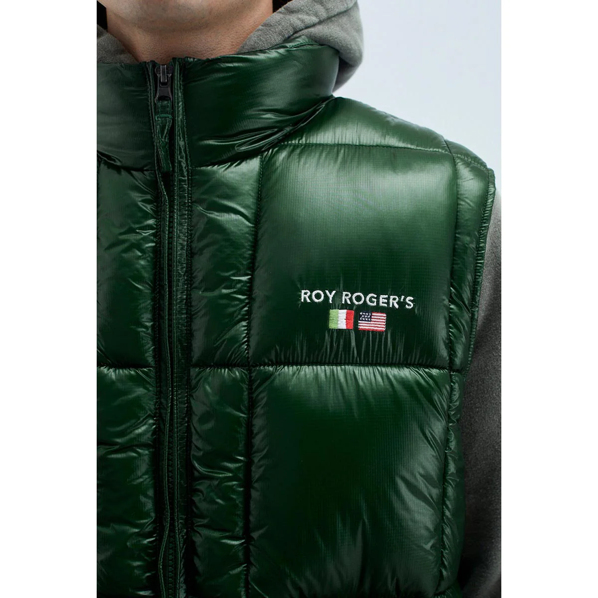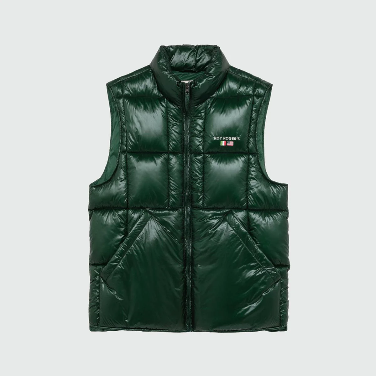 Gilet in nylon ripstop tinta unita trapuntato a coste. Colletto a imbuto. Chiusura con zip. Tasche oblique sul fronte. Ricamo Roy Roger’s sul peto. Regular fit.