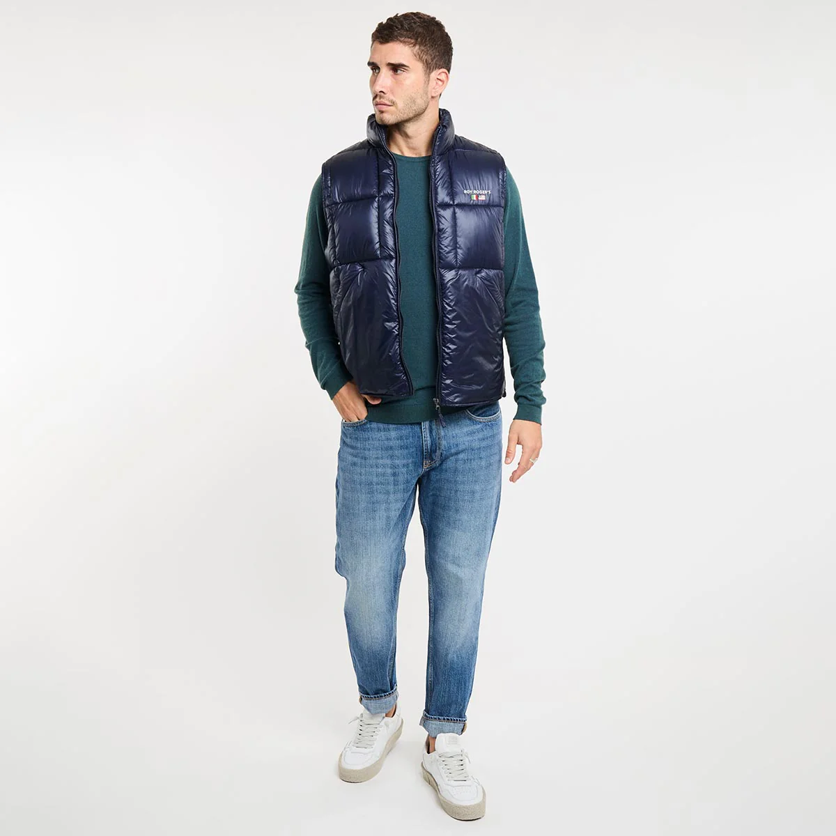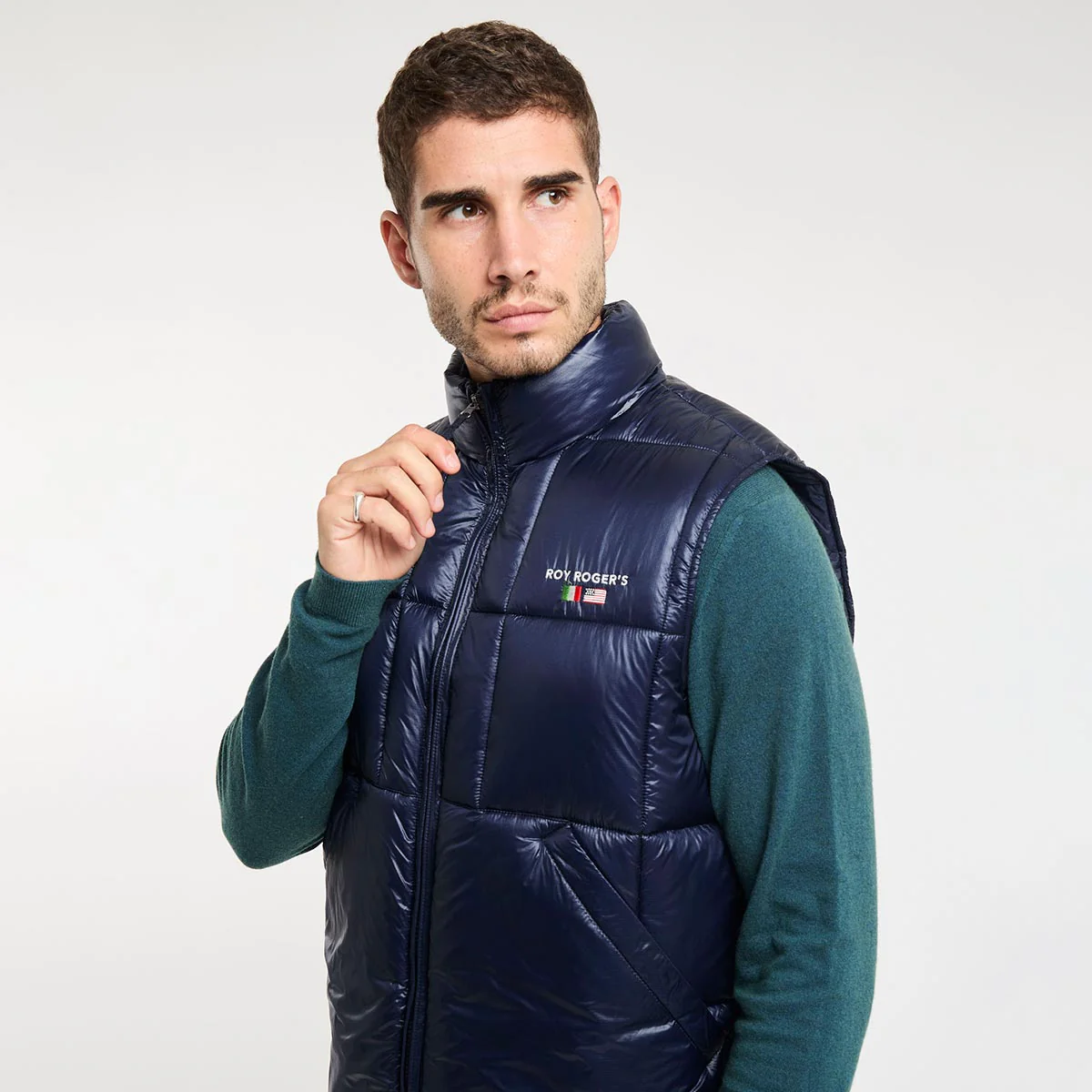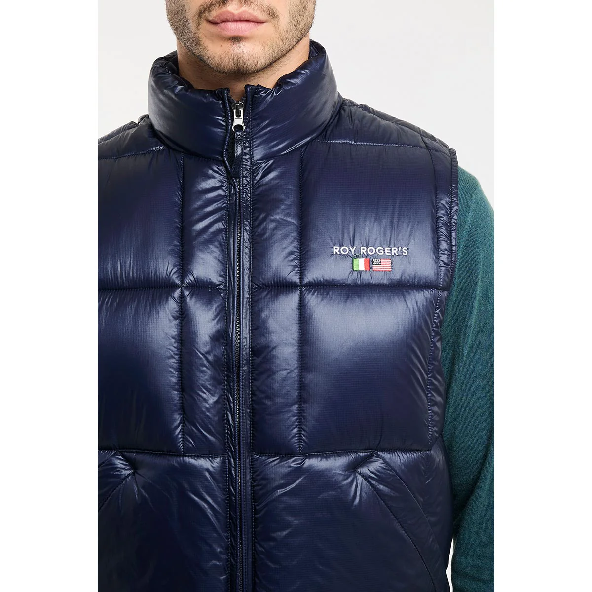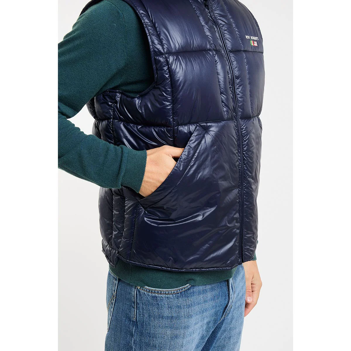 Gilet in nylon ripstop tinta unita trapuntato a coste. Colletto a imbuto. Chiusura con zip. Tasche oblique sul fronte. Ricamo Roy Roger’s sul peto. Regular fit.