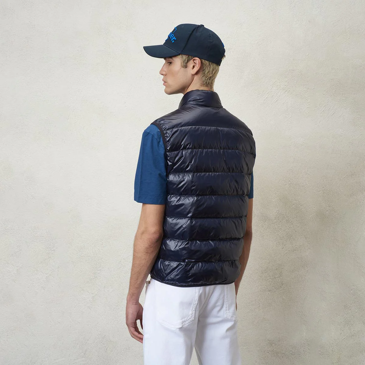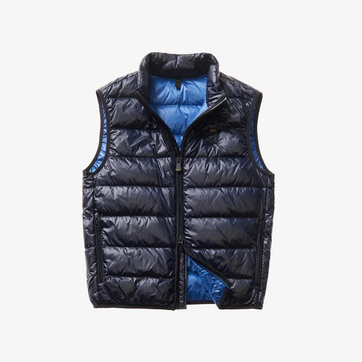 Piumino senza maniche in nylon lucido imbottito piuma con impuntura a linee orizzontali. Colletto basso alla coreana e fodera interna in contrasto colore.