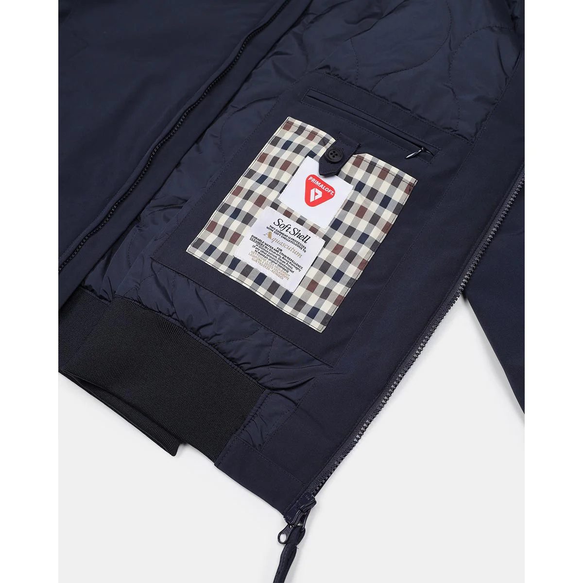 Giacca realizzata in Soft Shell — tessuto doppio strato in poliestere e spandex — questa giacca presenta un collo mockneck con cappuccio nascosto in tessuto Club Check. L’interno è imbottito in Primaloft®, con trapuntatura a cipolla e spallone in Club Check. Due tasche frontali diagonali applicate e costine in poliestere a un foglio su polsi e fondo.