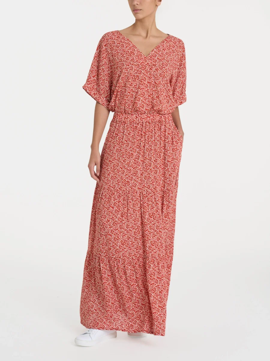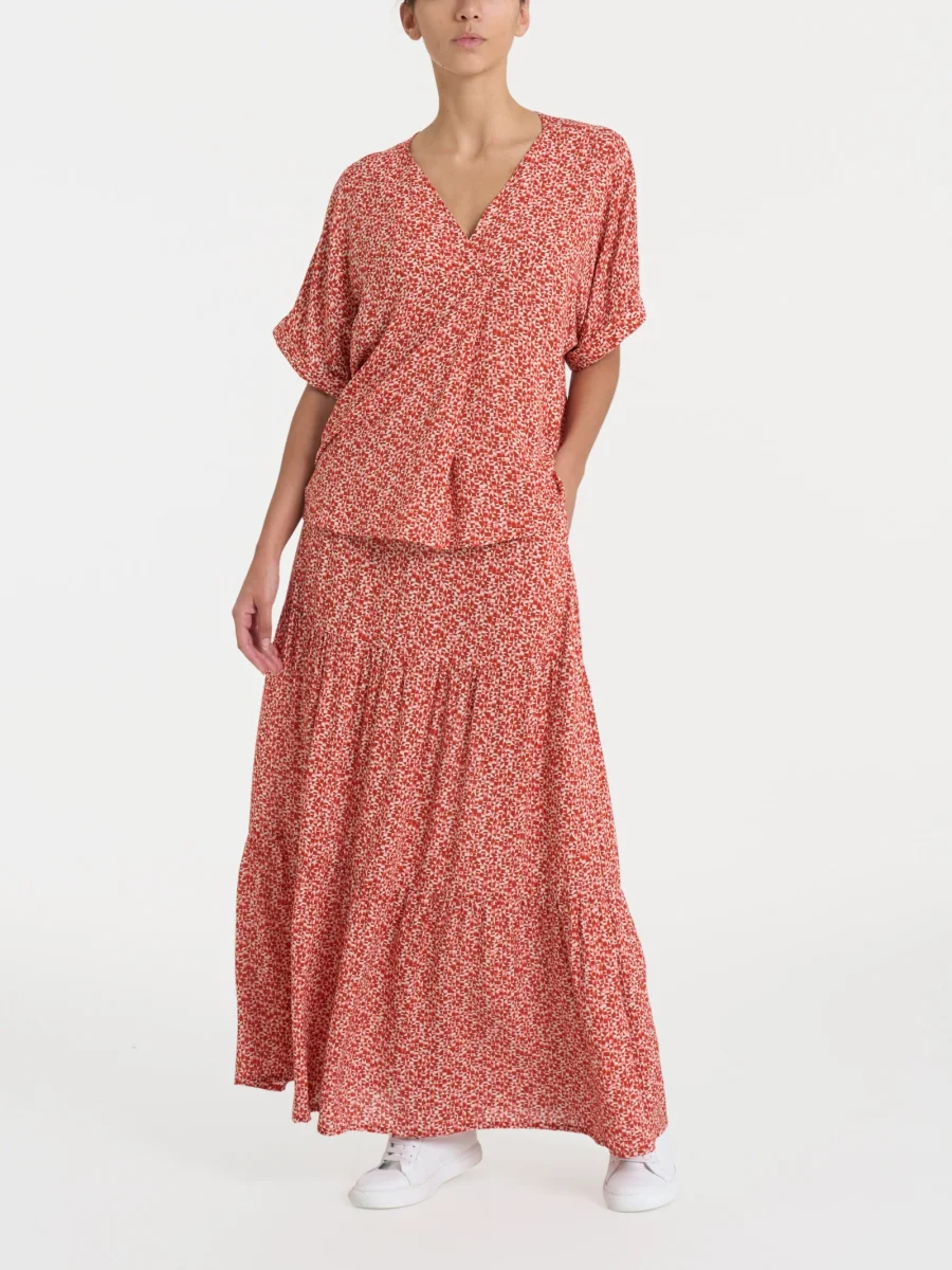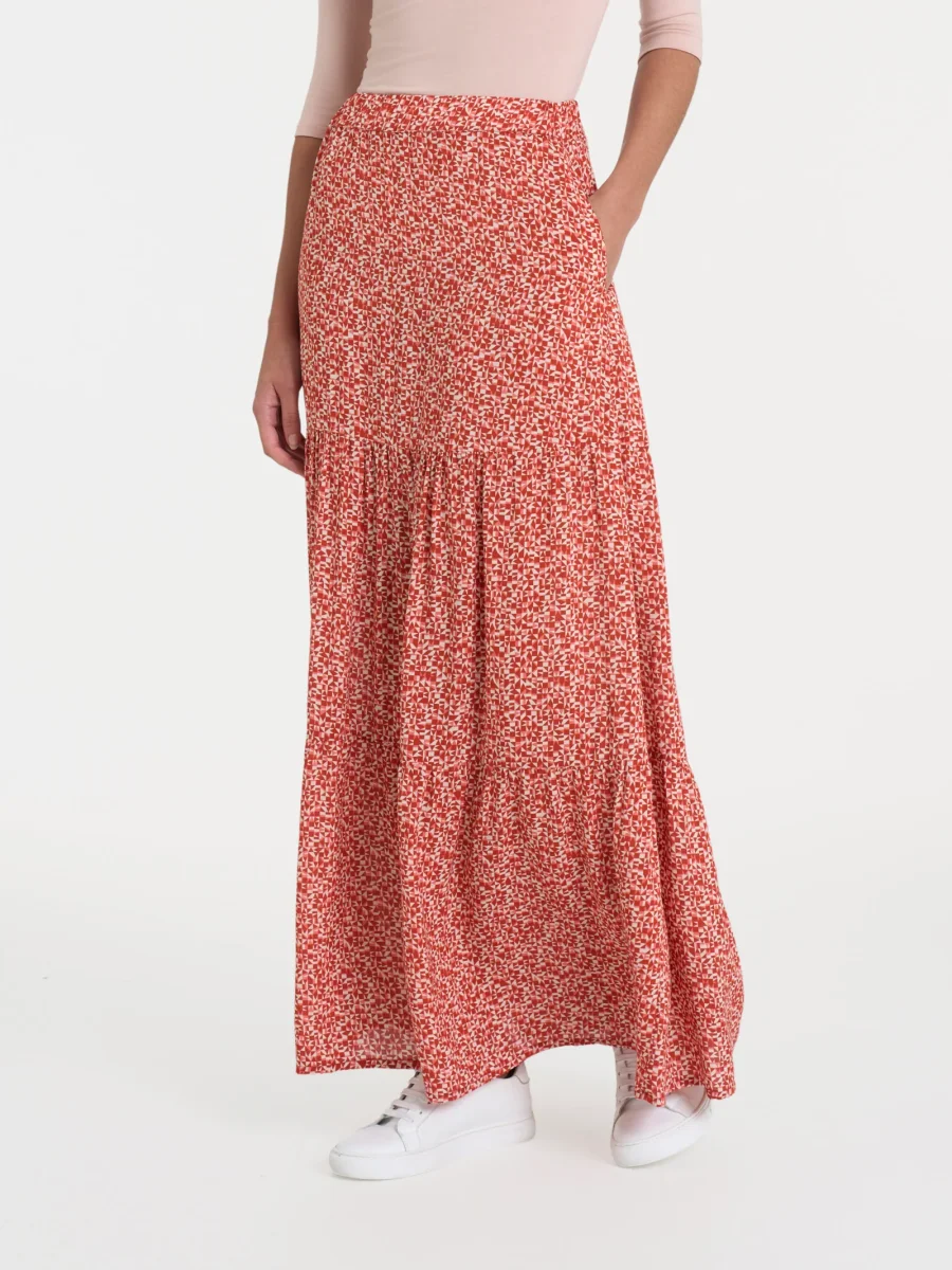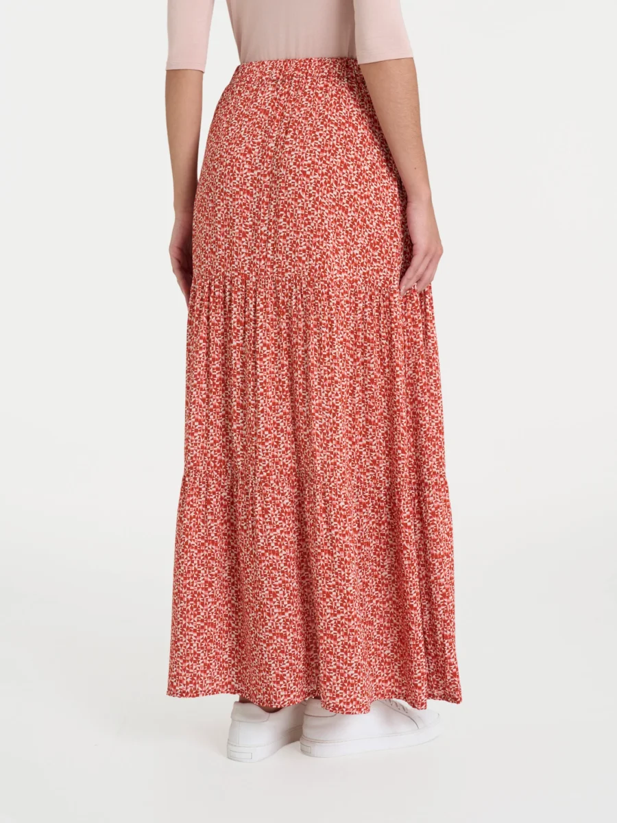 Gonna lunga a balze da donna realizzata in morbida e fluida viscosa.