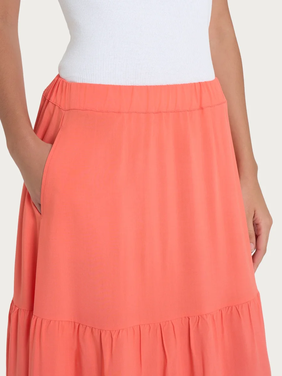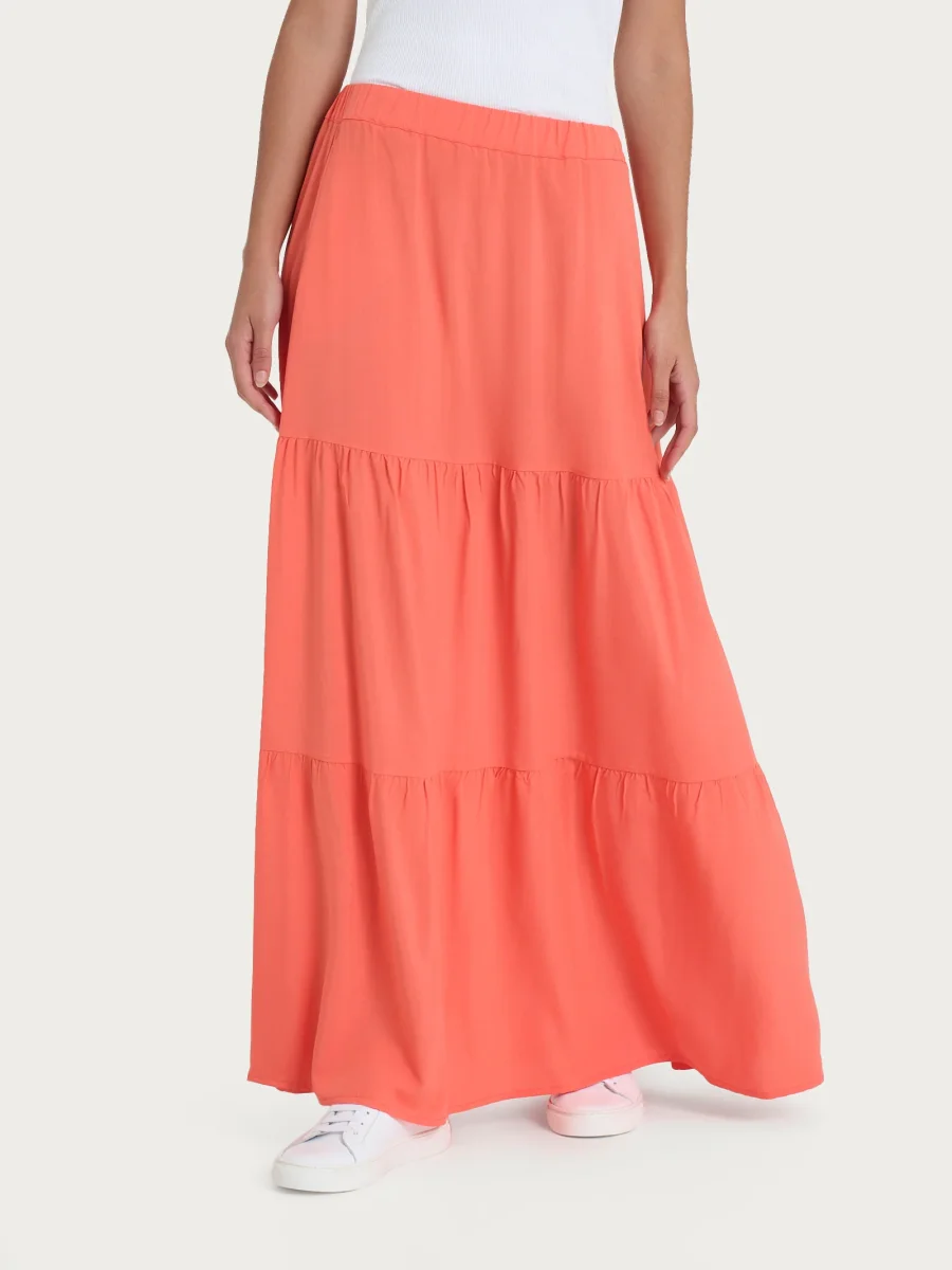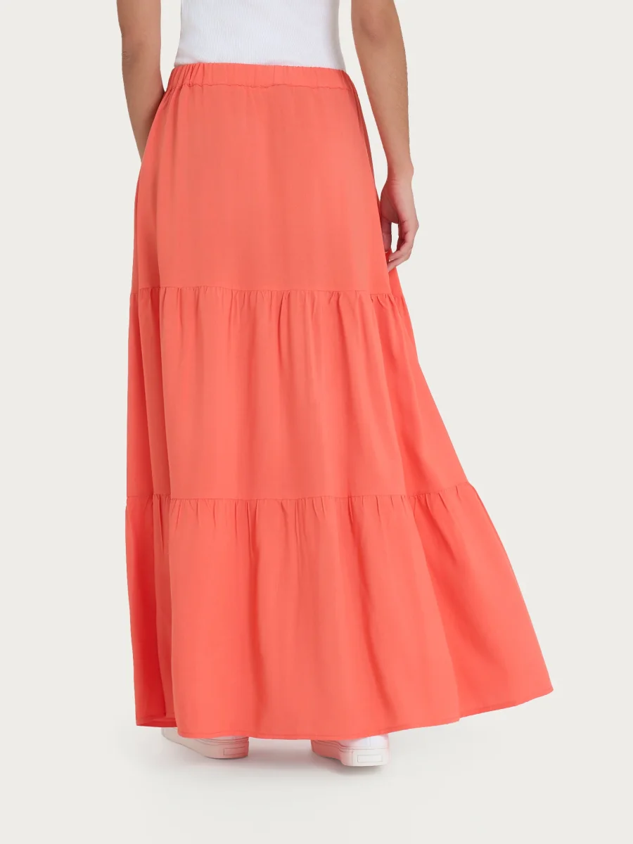 Gonna lunga a balze da donna realizzata in morbida e fluida viscosa.