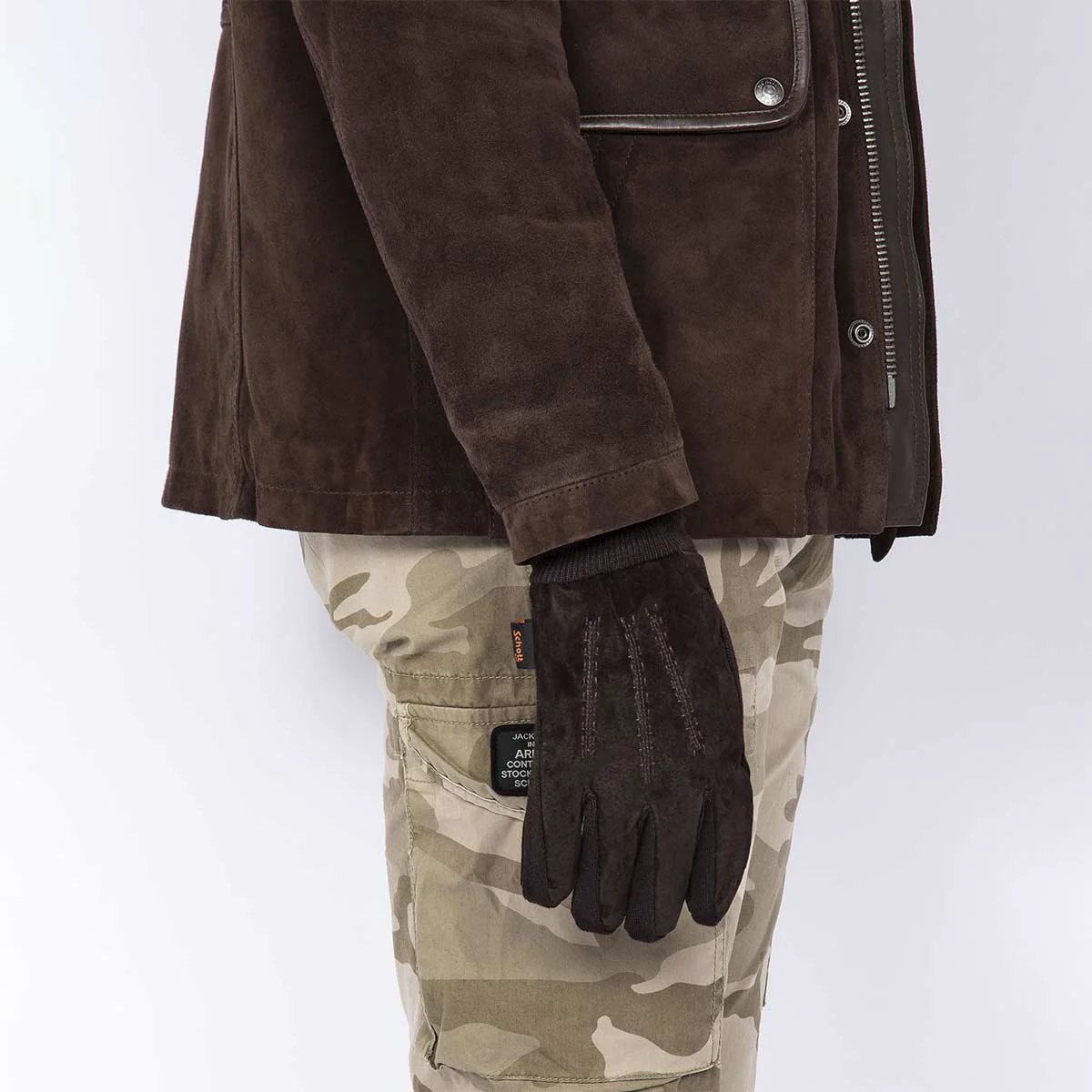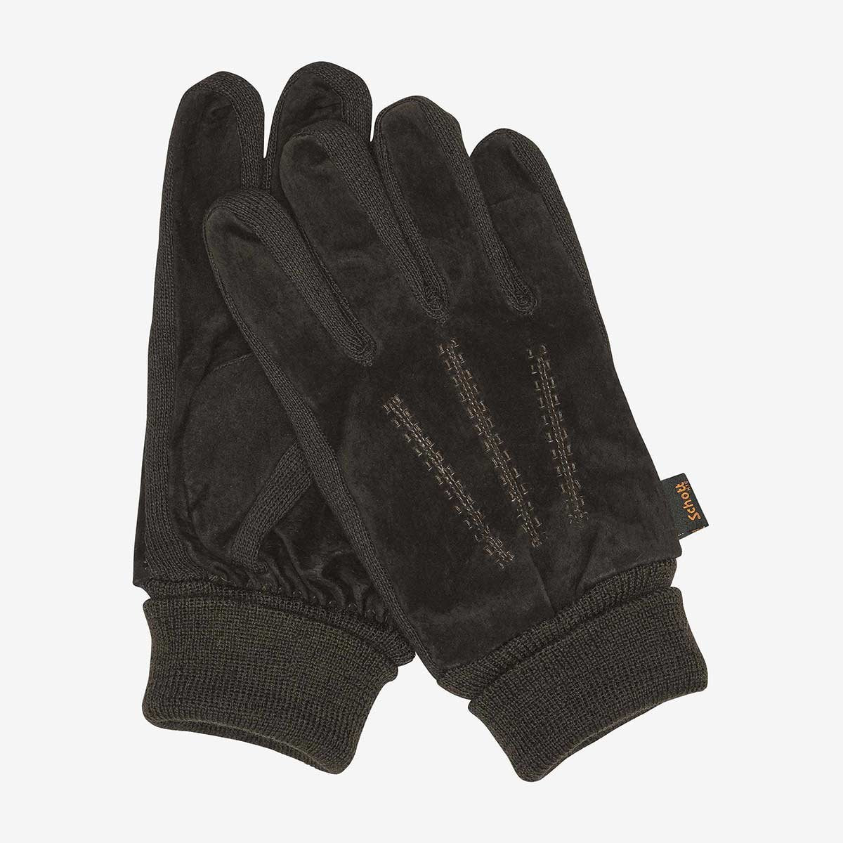 Guanti scamosciati, polsini in maglia a coste, fodera in pile polare, dita laterali in maglia.