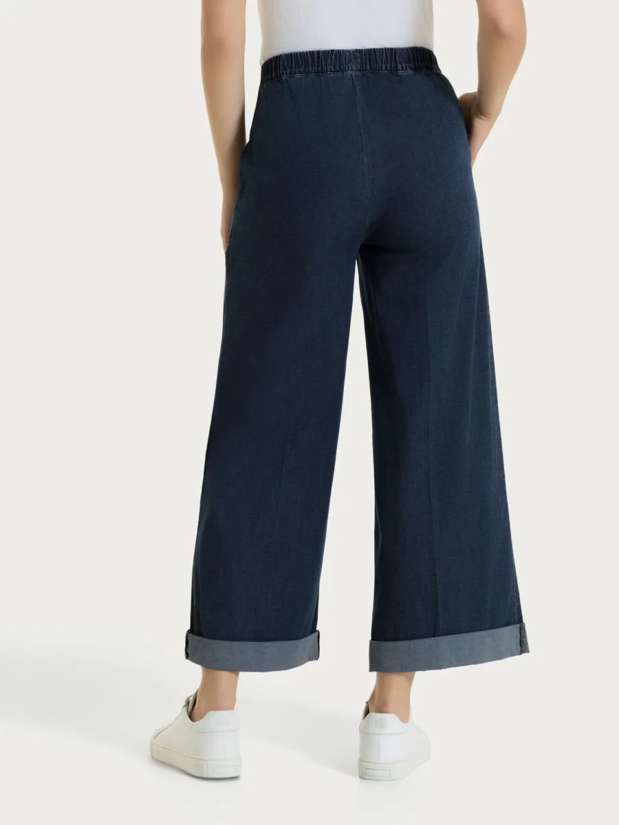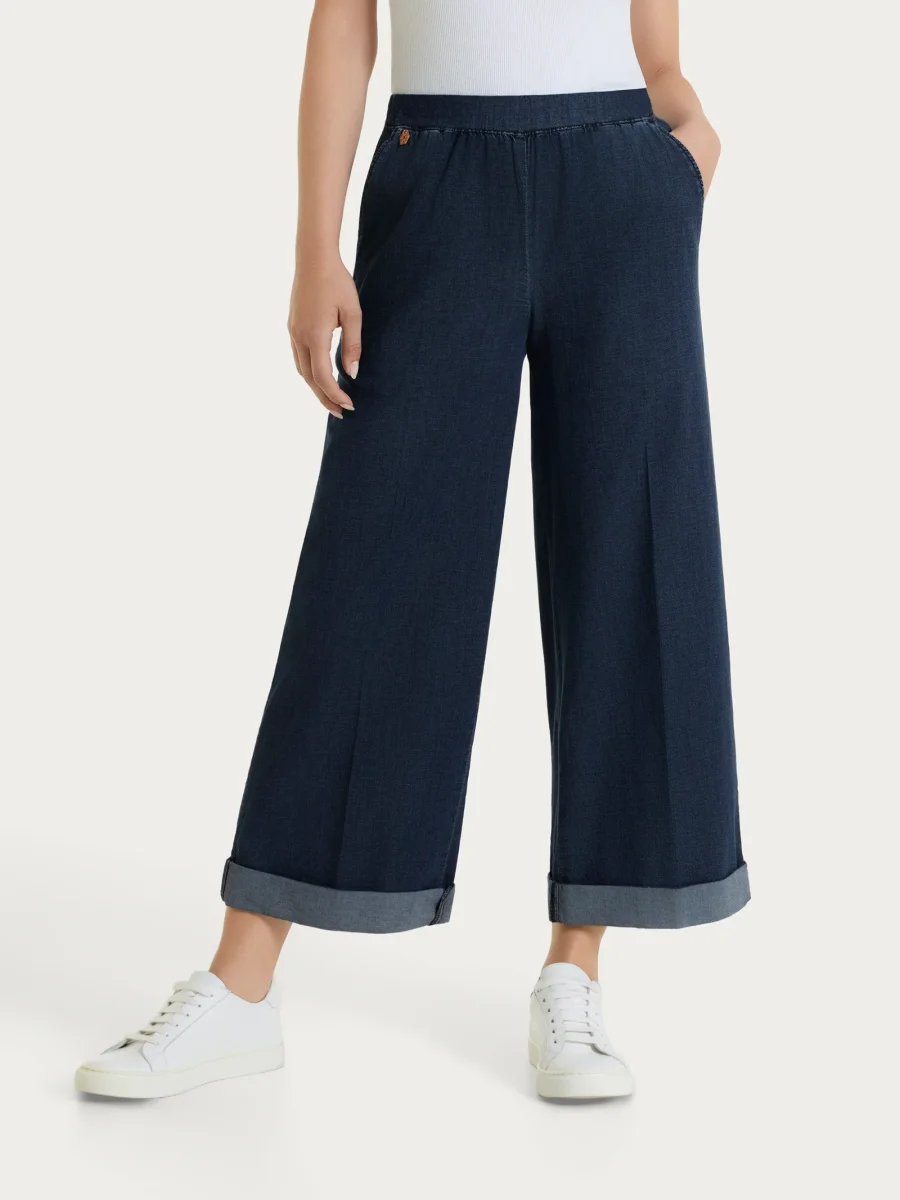 È un capo comodo e curato, progettato per una vestibilità semplice e immediata. La linea cropped wide lascia la gamba ampia e fluida, valorizzando la caviglia e garantendo libertà di movimento e un aspetto sempre ordinato. Il design essenziale, arricchito dal finish luminoso, lo rende ideale sia per abbinamenti casual sia per outfit più ricercati.