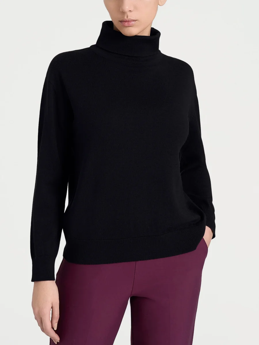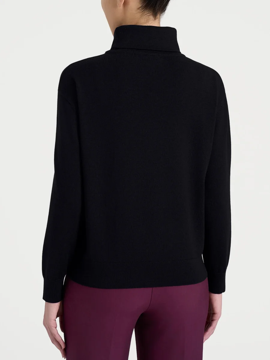 Questo modello è caratterizzato da un collo alto che, senza stringere, avvolge con delicatezza e dona calore, rifinito da una costina 1×1 che richiama quella presente anche su bordi e fondo per un effetto coerente e curato.