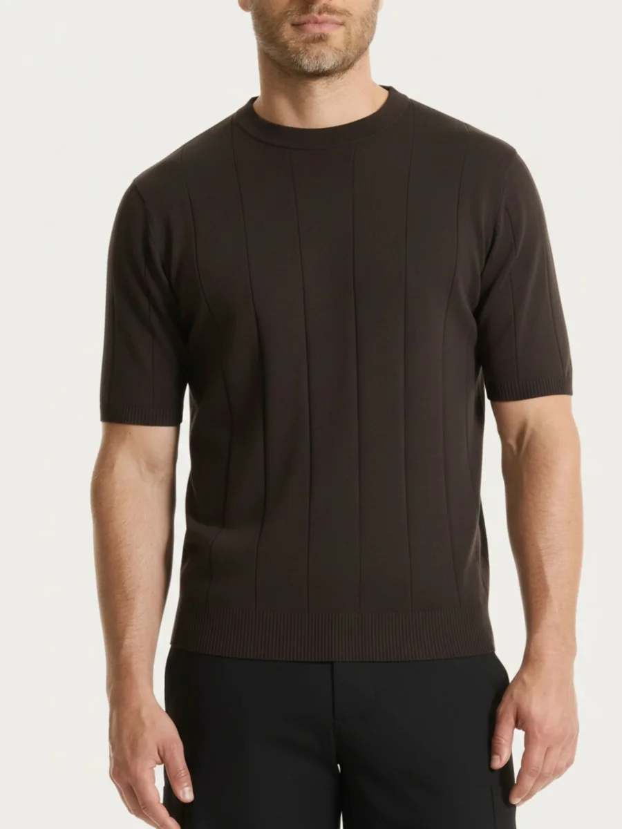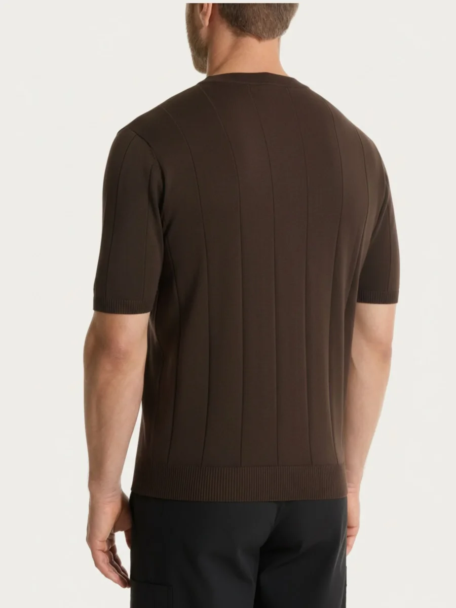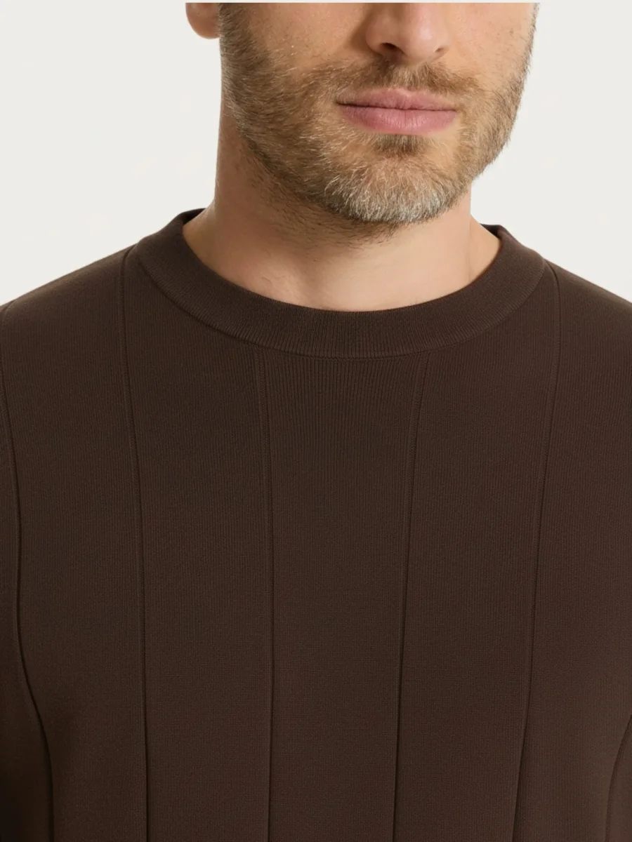 Il capo con vestibilità regular è lavorato a costa piatta, una trama pulita e regolare che dona un aspetto compatto e curato. La particolarità è la rigatura verticale ottenuta direttamente in maglia: il disegno nasce dall’alternanza della lavorazione, creando un effetto a rilievo regolare e percepibile al tatto, integrato nel tessuto e stabile nel tempo.