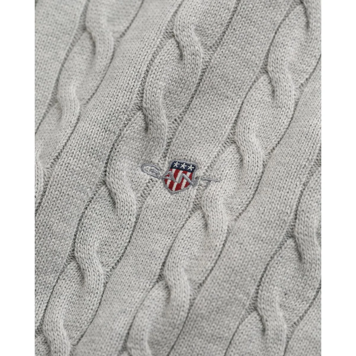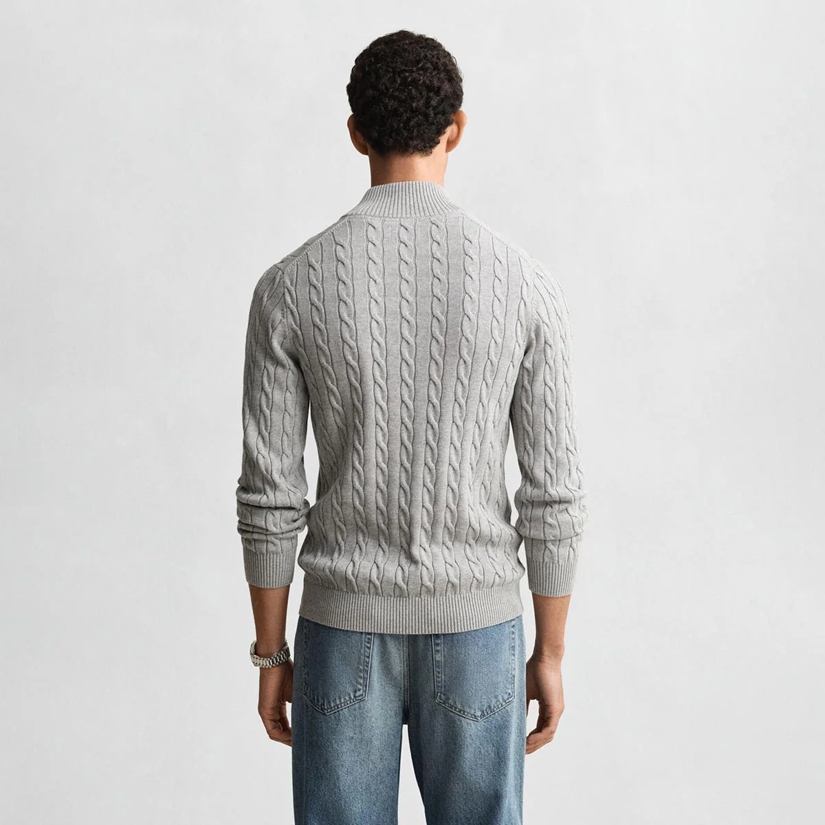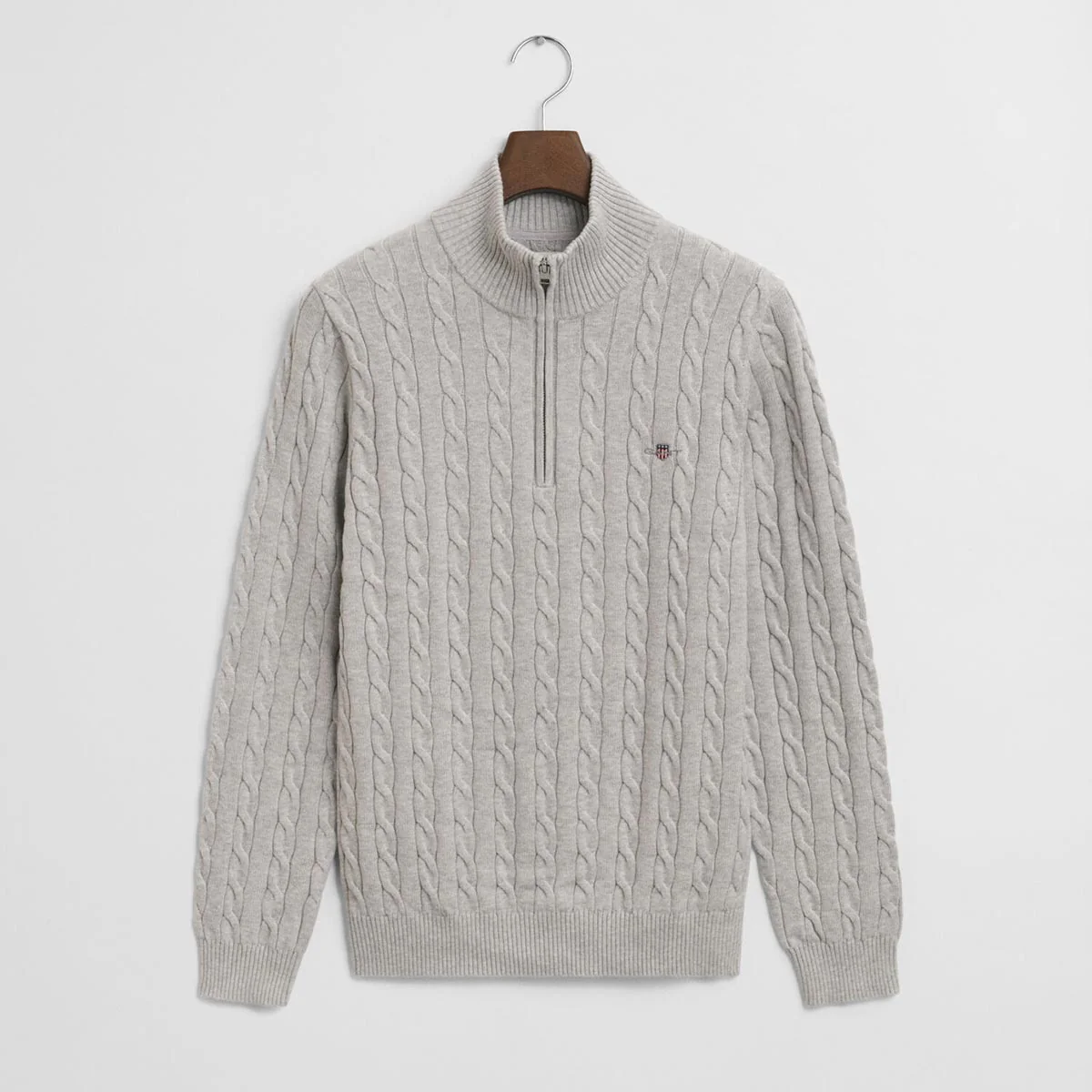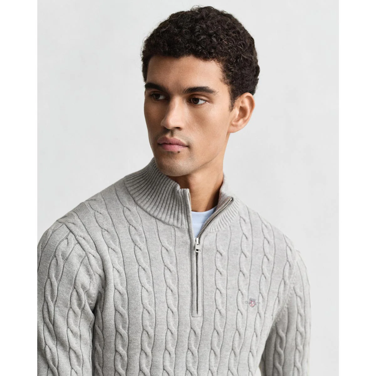 Maglione con mezza zip in cotone, con lavorazione a trecce, logo applicato sul petto. Motivo a costine sul fondo, sul colletto e nei polsini.