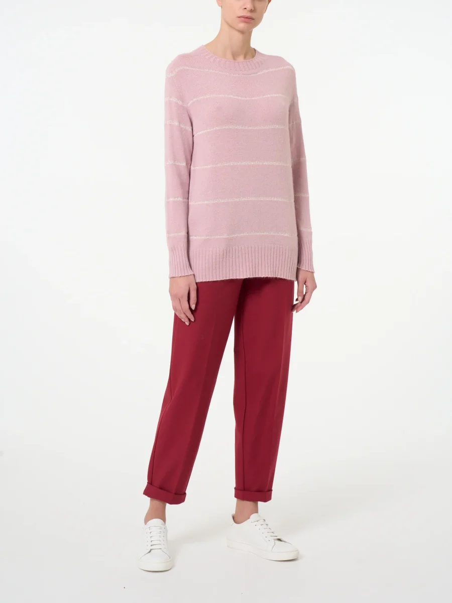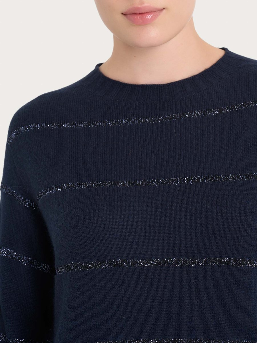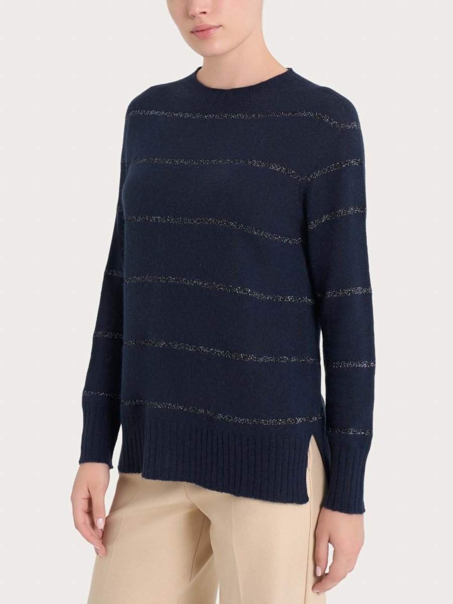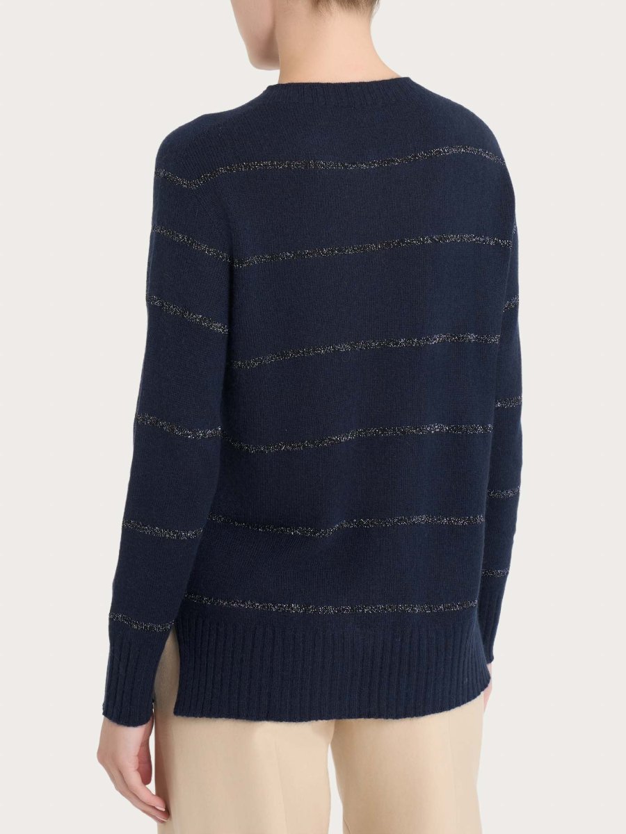 Questo capo ha una fantasia a righe eleganti, ovvero righe sottili nate dall’utilizzo del lurex e delicate per un aspetto più elegante e discreto.