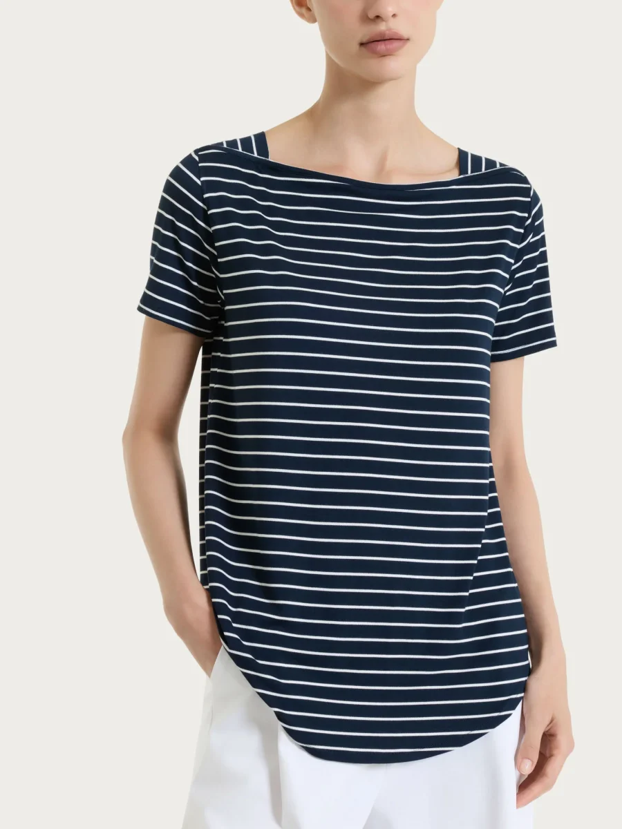 Maglietta da donna con collo a barchetta realizzata in Summer Light Piquet, una viscosa leggera ed elasticizzata, fresca e confortevole sulla pelle.
