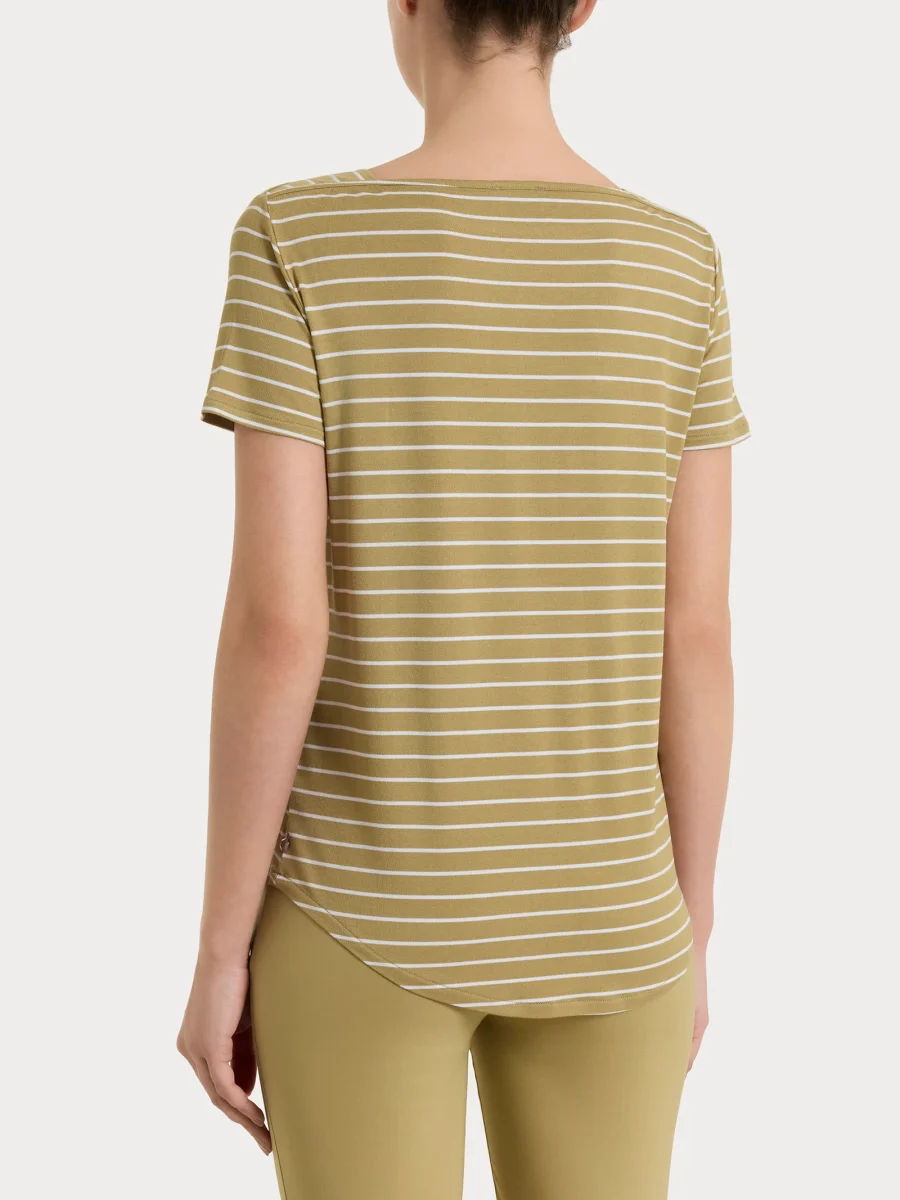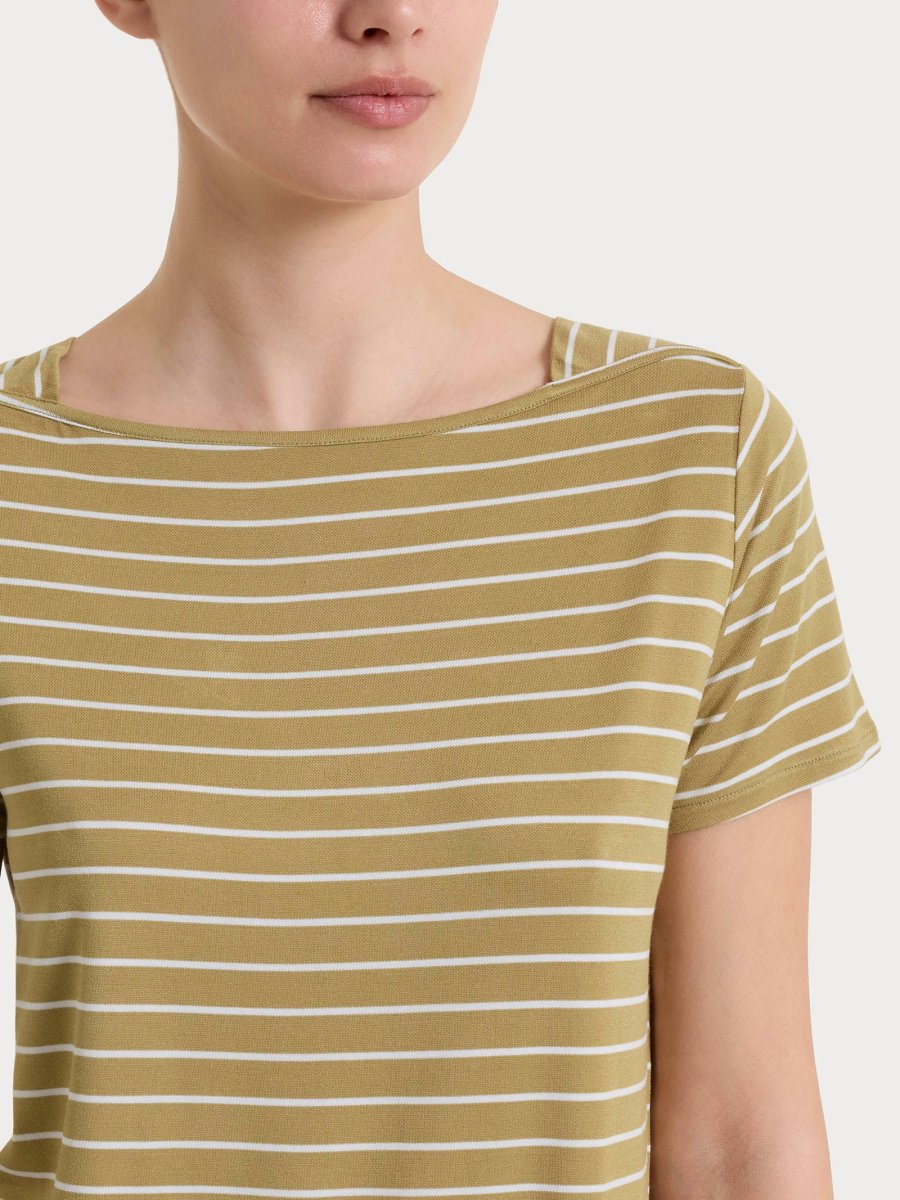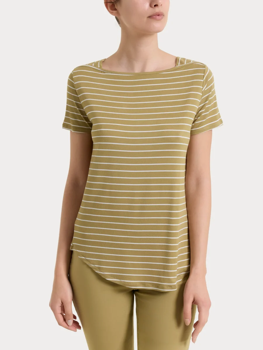 Maglietta da donna con collo a barchetta realizzata in Summer Light Piquet, una viscosa leggera ed elasticizzata, fresca e confortevole sulla pelle.