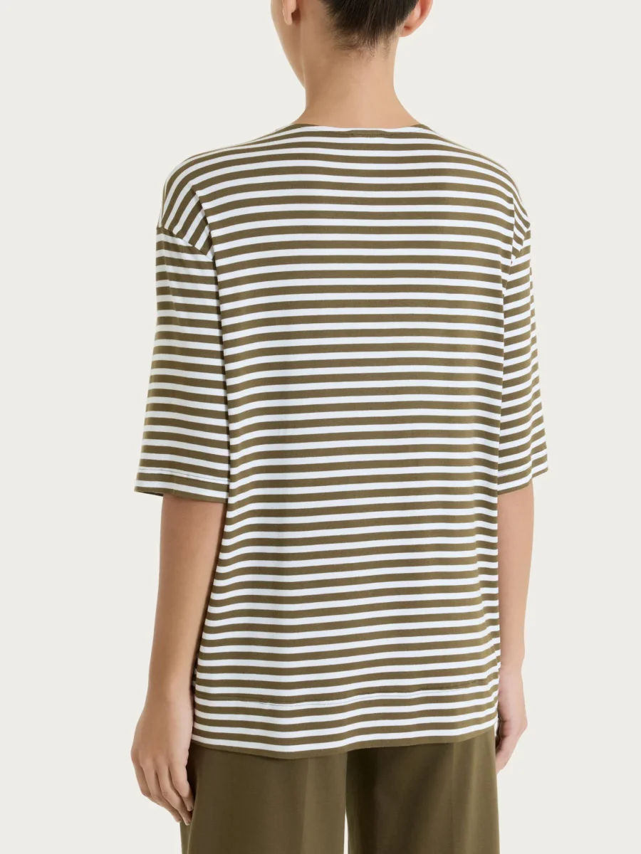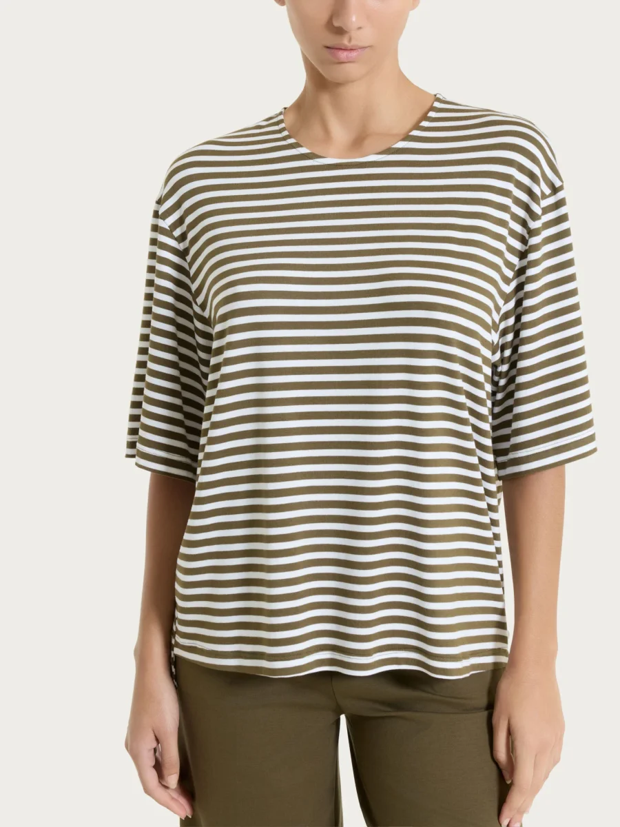 La fantasia a righe classiche alternate richiama un’estetica senza tempo, rivisitata in una versione attuale e contemporanea. La vestibilità boxy, ampia e diritta, crea una silhouette attuale e rilassata, offrendo comfort e libertà di movimento, mentre la lunghezza della manica al gomito da una copertura leggera e pratica.