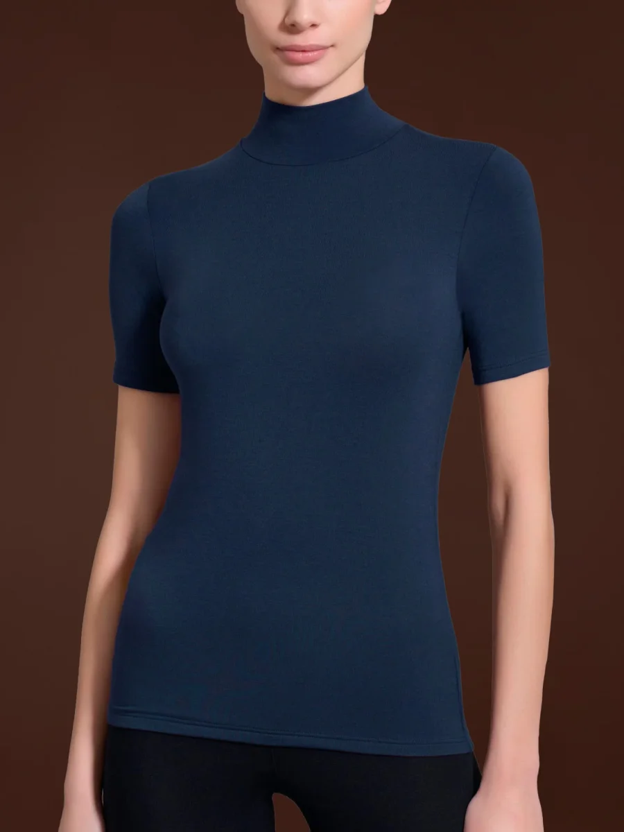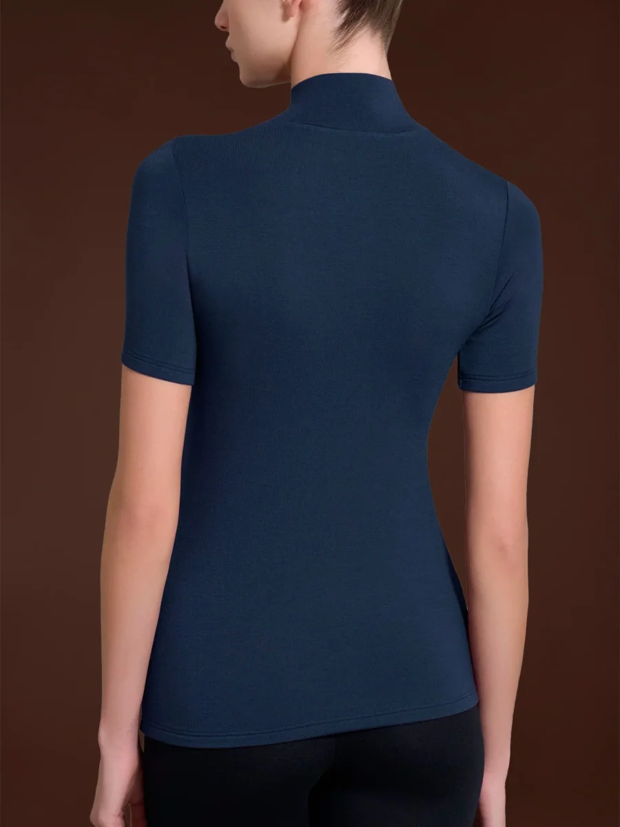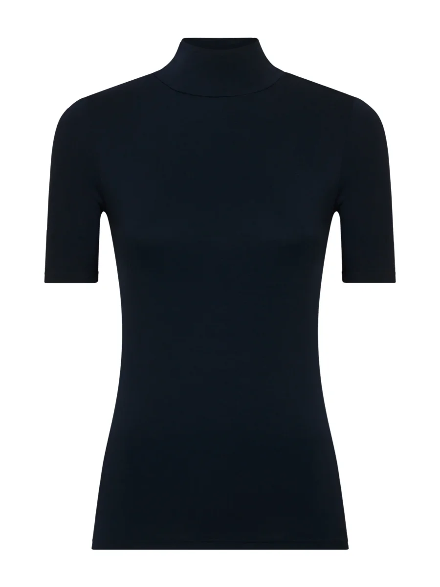 Maglietta con collo alto a lupetto e manica corta da donna in jersey di viscosa elasticizzata.