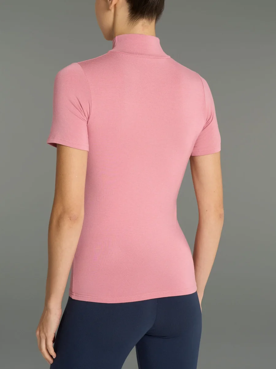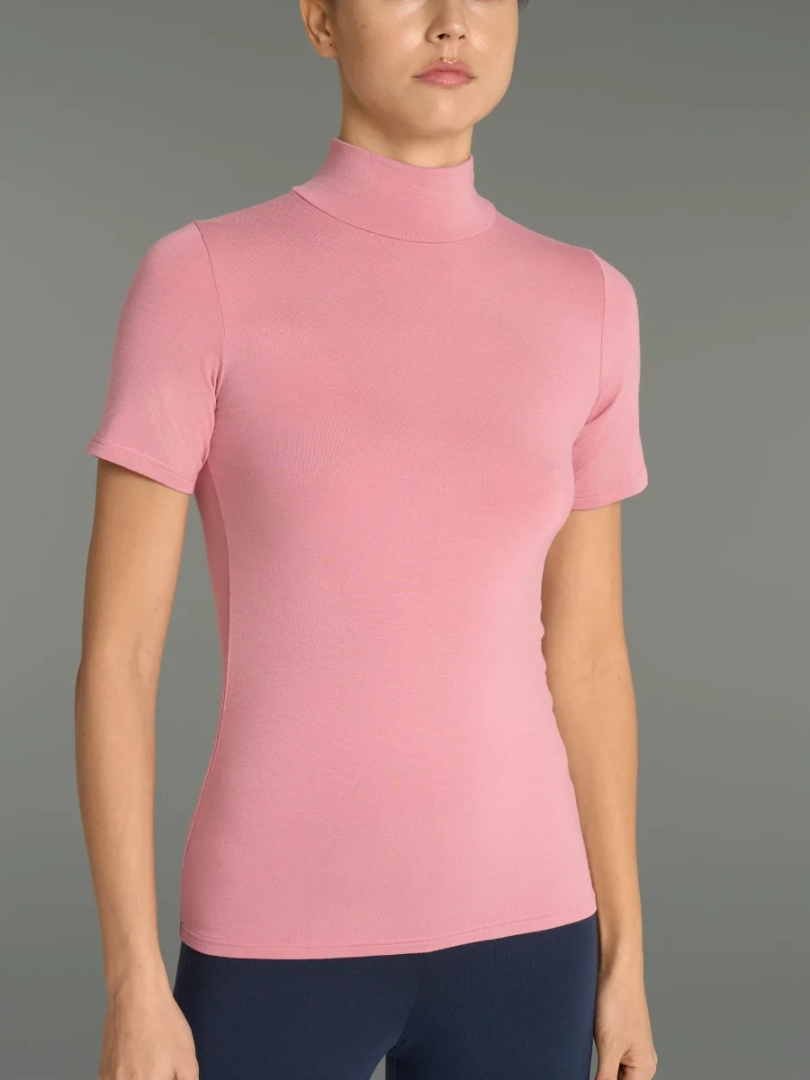 Maglietta con collo alto a lupetto e manica corta da donna in jersey di viscosa elasticizzata.