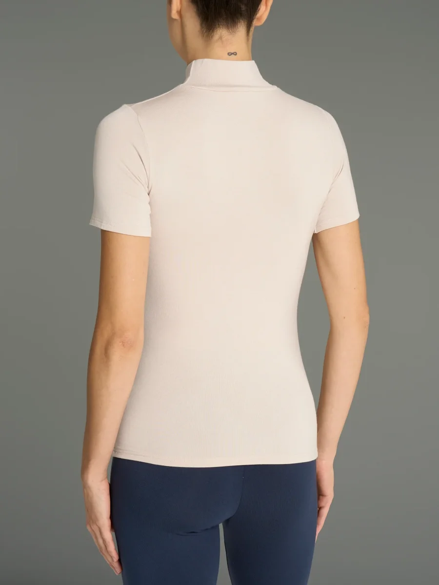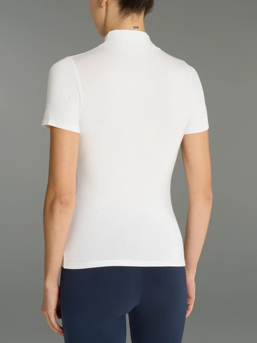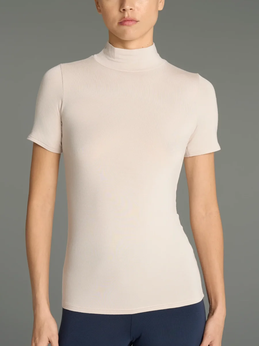 Maglietta con collo alto a lupetto e manica corta da donna in jersey di viscosa elasticizzata.