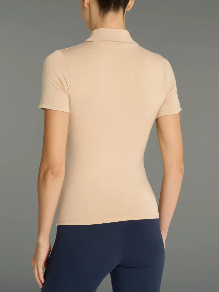 Maglietta con collo alto a lupetto e manica corta da donna in jersey di viscosa elasticizzata.