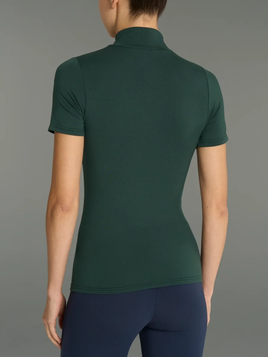 Maglietta con collo alto a lupetto e manica corta da donna in jersey di viscosa elasticizzata.