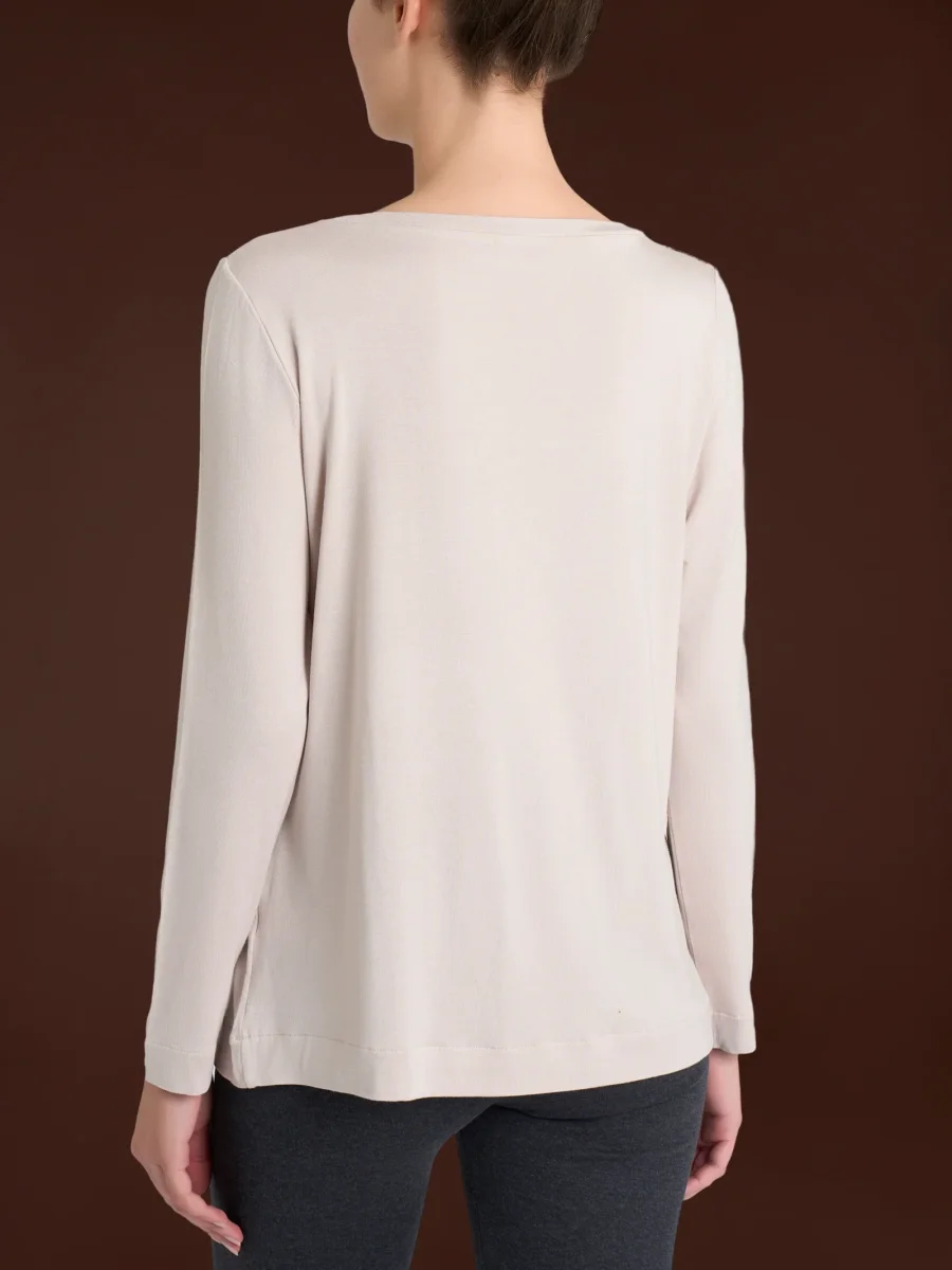 Questo capo con una vestibilità è morbida e fluida, per una maggiore comodità e praticità quotidiana, è tinta unita con collo a barchetta e a manica lunga.