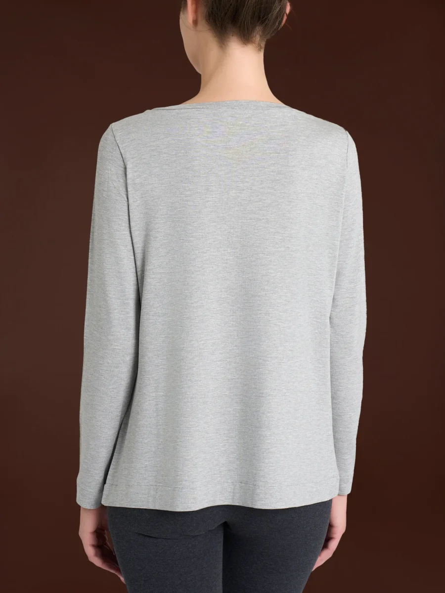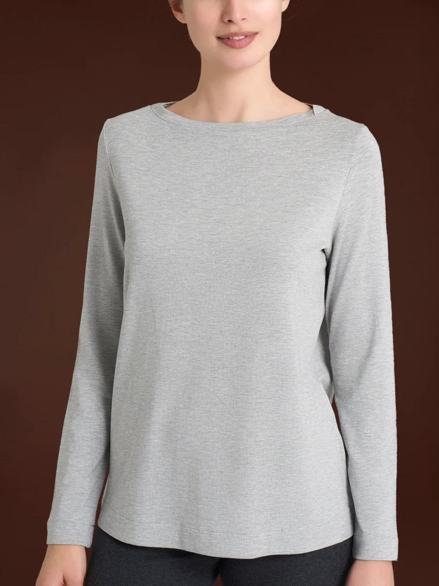 Questo capo con una vestibilità è morbida e fluida, per una maggiore comodità e praticità quotidiana, è tinta unita con collo a barchetta e a manica lunga.