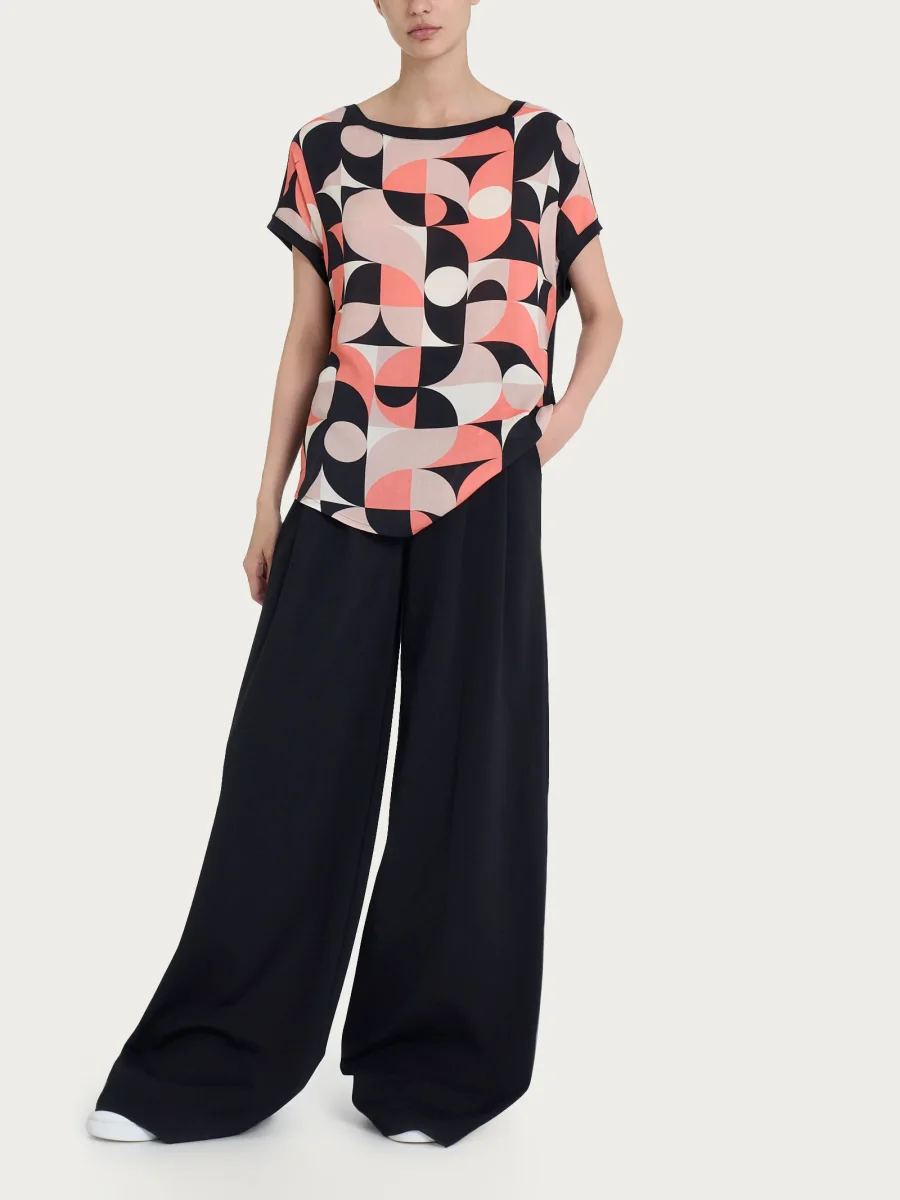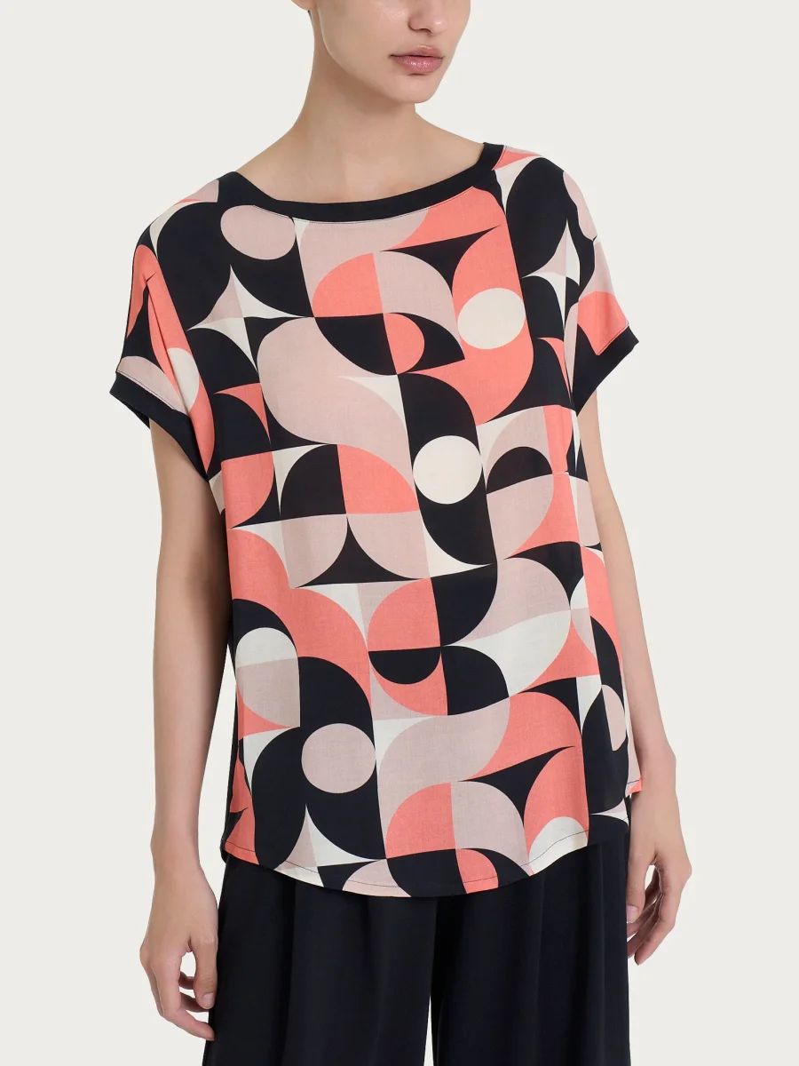 Il girocollo tradizionale dona al capo una linea semplice ed elegante, mentre le maniche corte in stile kimono offrono un’ampia libertà di movimento, rendendo questa t-shirt perfetta per affrontare con leggerezza le giornate più calde.