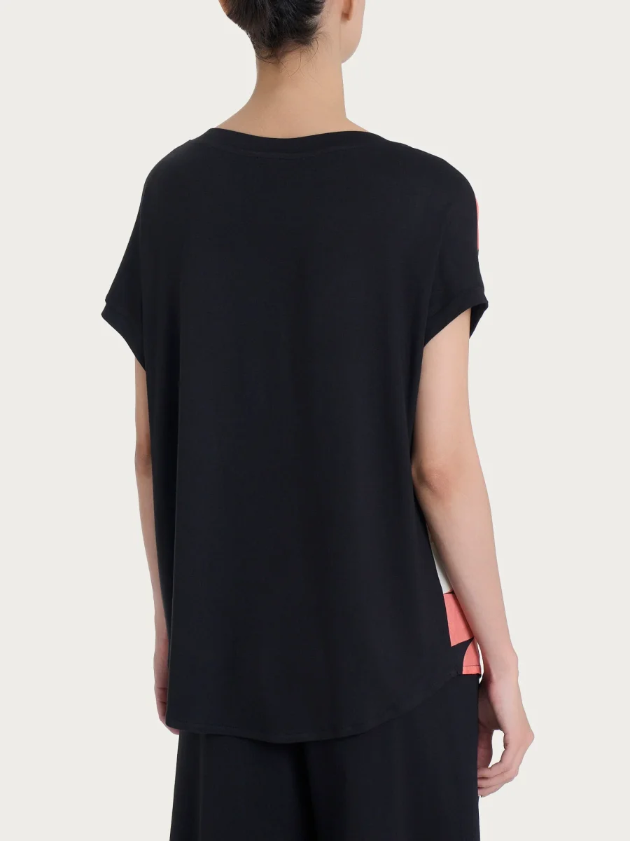 La parte frontale è realizzata in un leggero jersey di viscosa, mentre il dietro è composto da un comodo jersey di viscosa elasticizzata. Questo mix rende il capo fresco, naturale e incredibilmente confortevole.