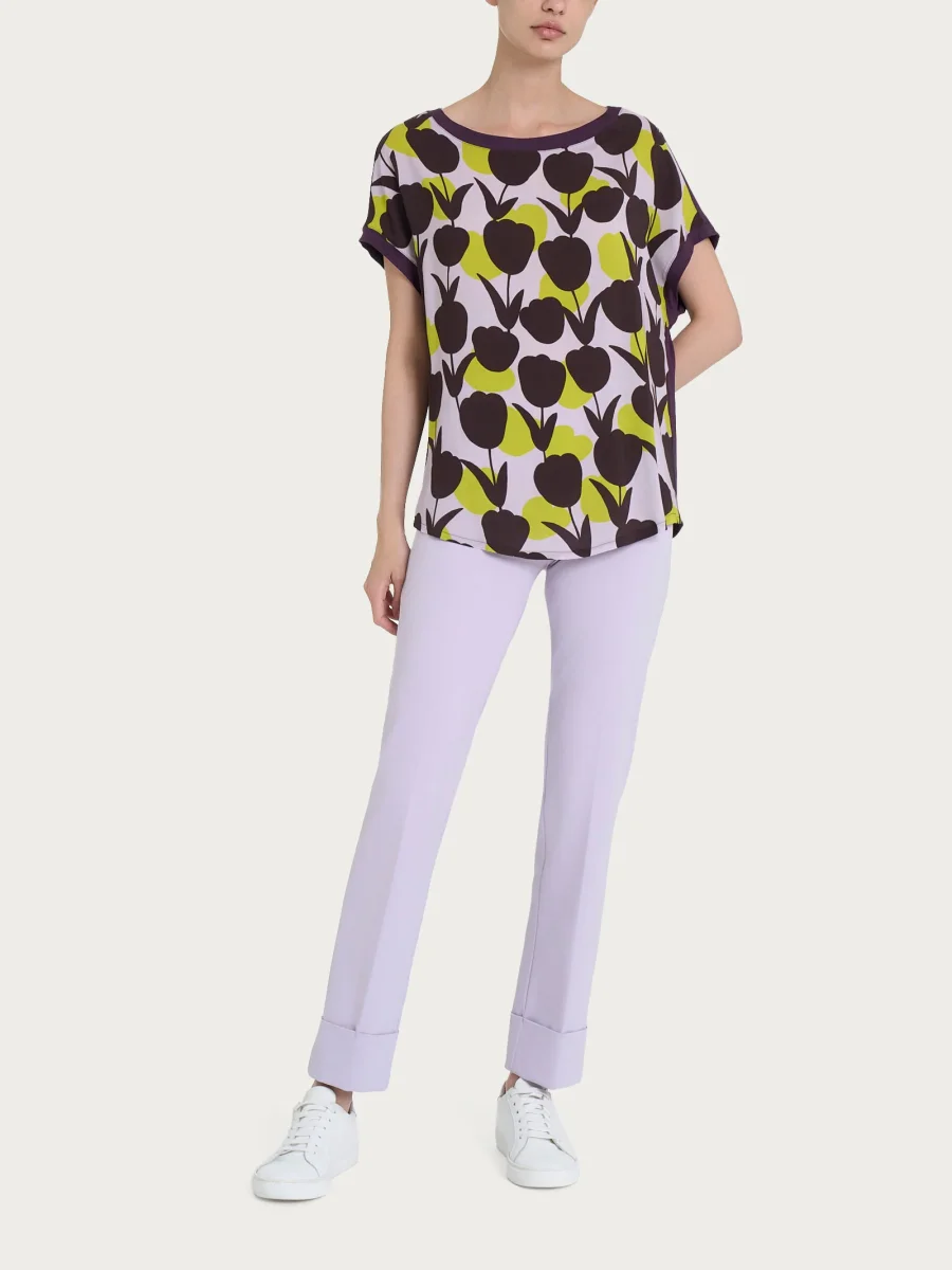 Caratterizzata da una fantasia a macro tulipani all over sulla parte frontale del capo che dona un tocco di vivacità e attira l’attenzione, questo capo si distingue per la presenza del tinta unita nel retro che dona un delicato contrasto richiamando il colore tinta unita presente sulla bordatura del capo.