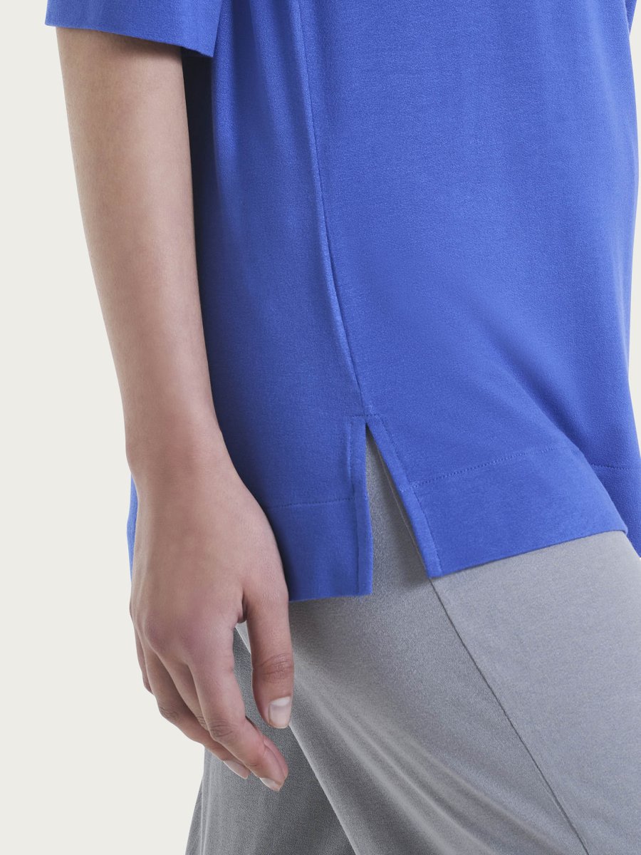 Realizzata con un tessuto di jersey in viscosa crêpe, tessuto che dona freschezza straordinaria e una caduta fluida. Ottenuto con filati ad alta torsione, che conferiscono una consistenza nervosa e increspata, bilanciata dalla delicata morbidezza della viscosa. La viscosa, essendo una fibra naturale e traspirante, rende il capo adatto a una varietà di situazioni, dalla vita quotidiana a occasioni casual all’aperto.